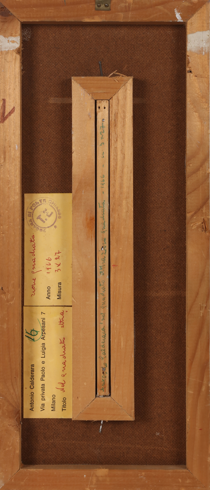 CALDERARA ANTONIO (1903 - 1978) Nel quadrato attrazione quadrata. 1966. Tecnica mista su tavola. Cm 3,00 x 27,00. Al retro titolo, firma e anno. Opera archiviata presso la Fondazione Antonio e Carmela Calderara, Milano come da documentazione fotografica allegata all'opera riportante il relativo numero d'inventario. Cornice presente