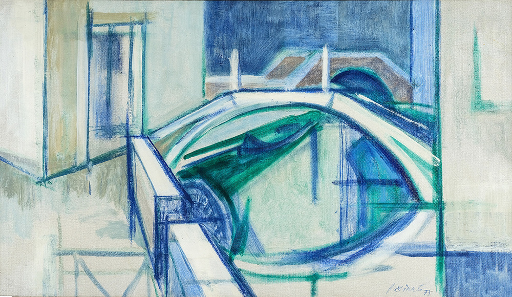 ARMANDO PIZZINATO 1910 - 2004 Ponte Venezia, 1973 Olio su tela, cm. 40 x 70 Firmato e datato in basso a destra Etichetta Galleria Schreiber, Brescia sul retro Prov. Collezione Privata