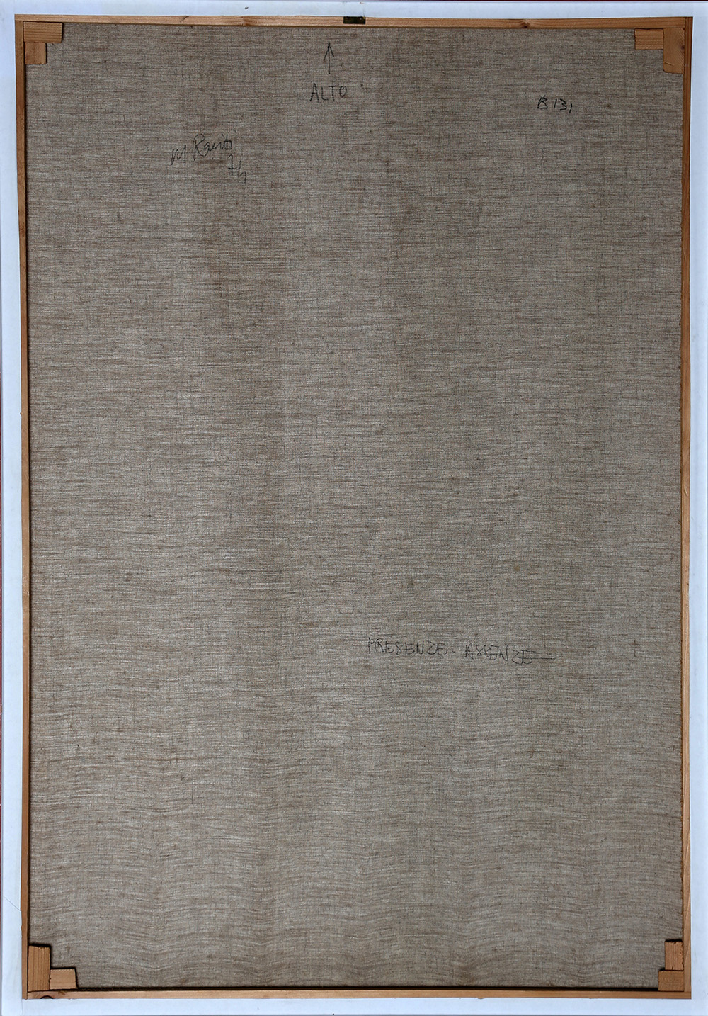 MARIO RACITI 1934 Presenze - assenze, 1974 Tecnica mista su tela, cm. 100 x 70 Firmato e datato sul retro Prov. Collezione Privata