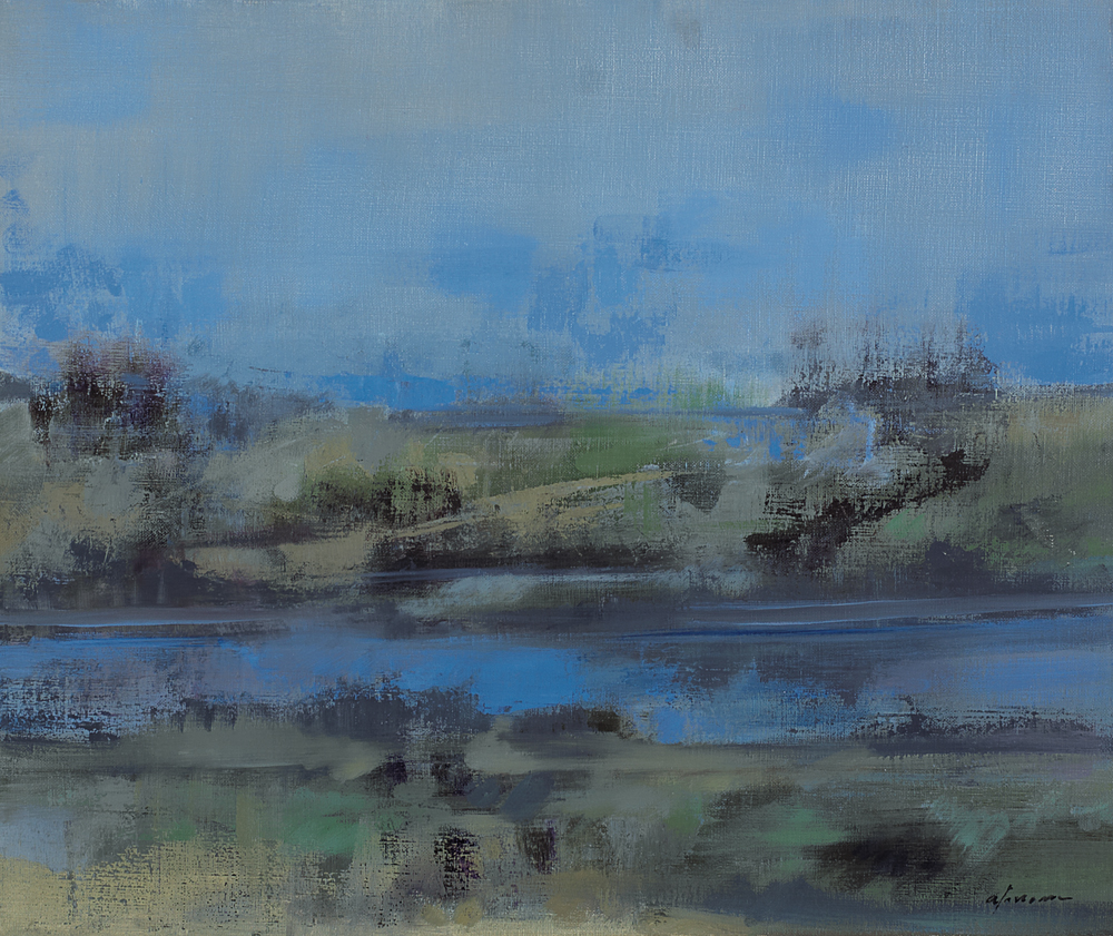 GIUSEPPE AJMONE Carpignano Sesia 17/02/1923 - 07/04/2005  Il Sesia, 1990 olio su tela cm. 47x55, firma in basso a destra, titolo e anno al retro, dichiarazione d'autenticità dell'artista su foto.