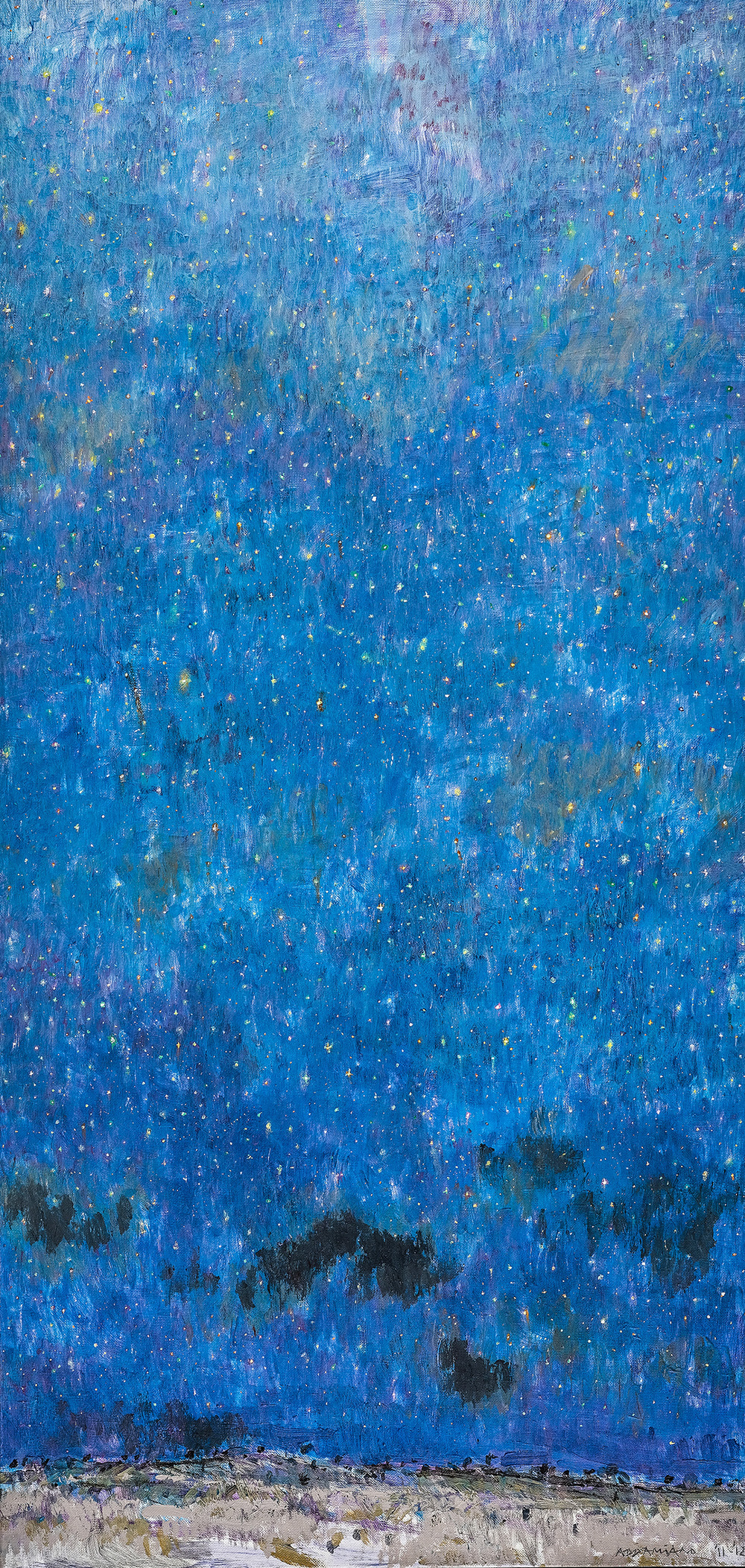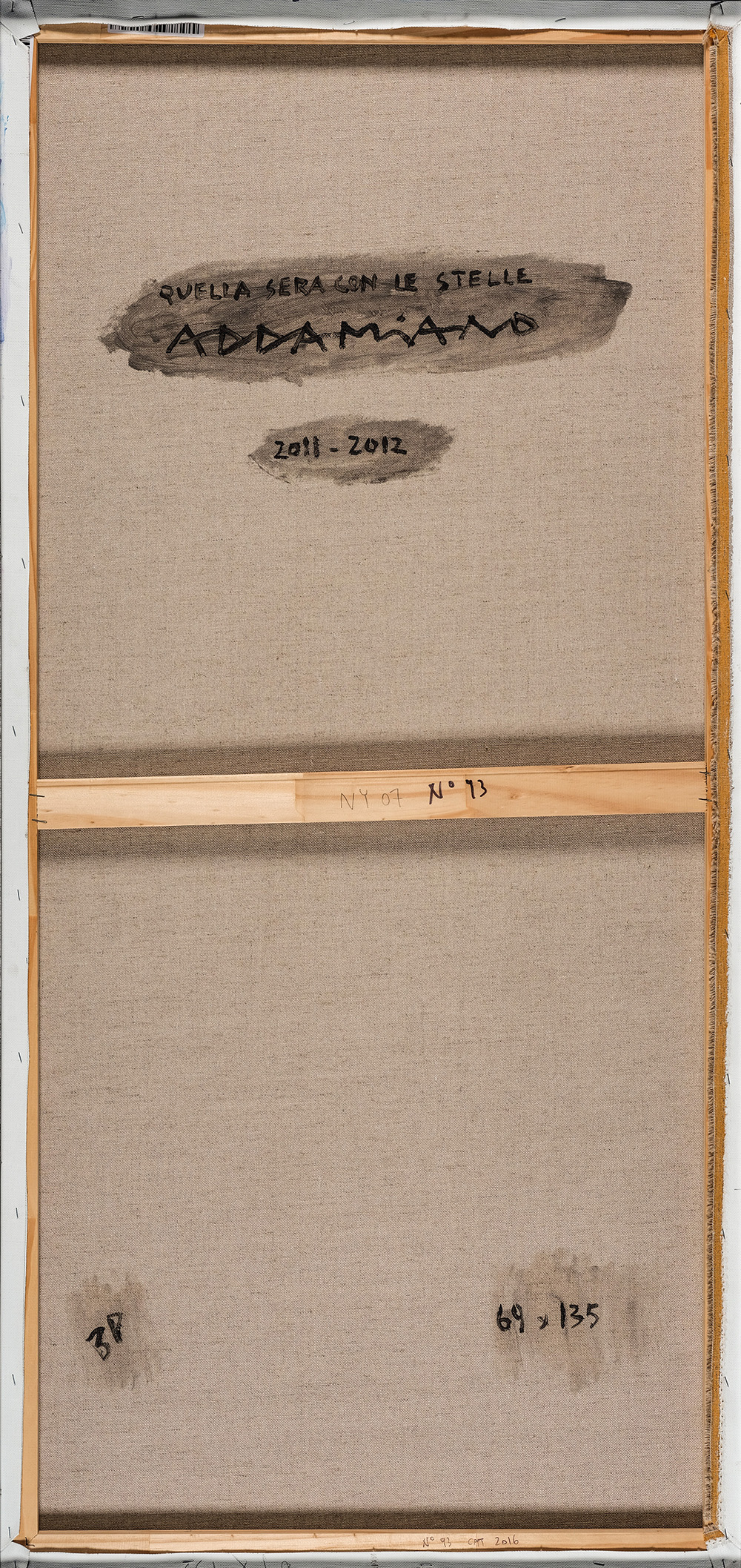NATALE ADDAMIANO 1943 Quella sera con le stelle, 2011-12 Olio su tela, cm. 127 x 61 Firmato e datato sul retro Autentica dell’artista su fotografia PUBBLICAZIONI: “Natale Addamiano - Cieli stellati”, Edizioni Galleria Deep Art, Milano, 2016, p. 121 Prov. Collezione Privata
