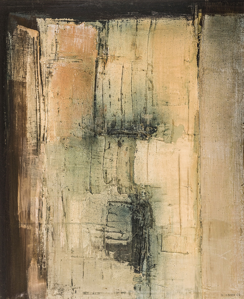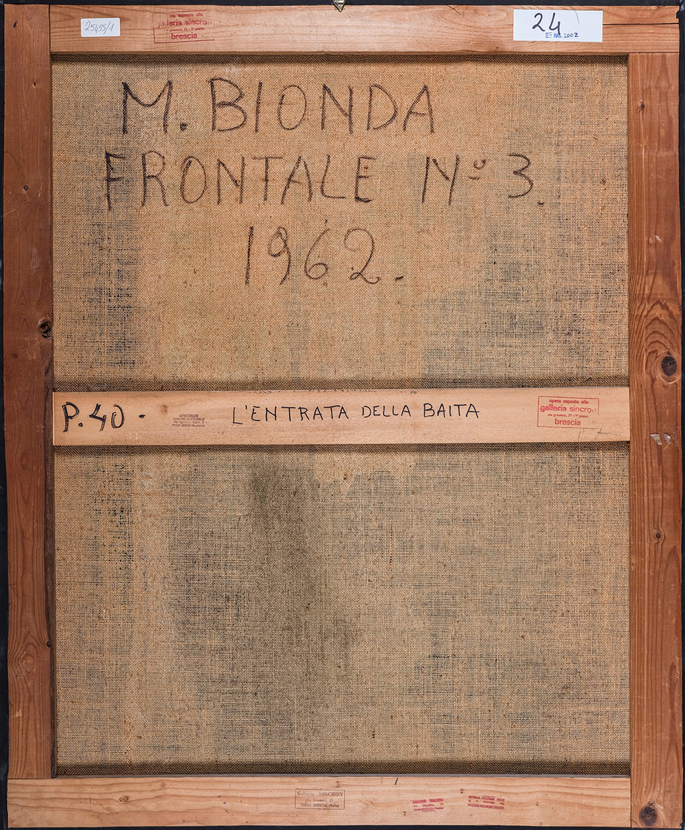 MARIO BIONDA 1913 - 1985 Frontale n.3, 1962 Tecnica mista su tela, cm. 100 x 80 Firmato e datato in basso a destra Timbro Galleria Sincron, Brescia sul retro Timbro Sincron Centro Culturale, Brescia sul retro Prov. Collezione Privata