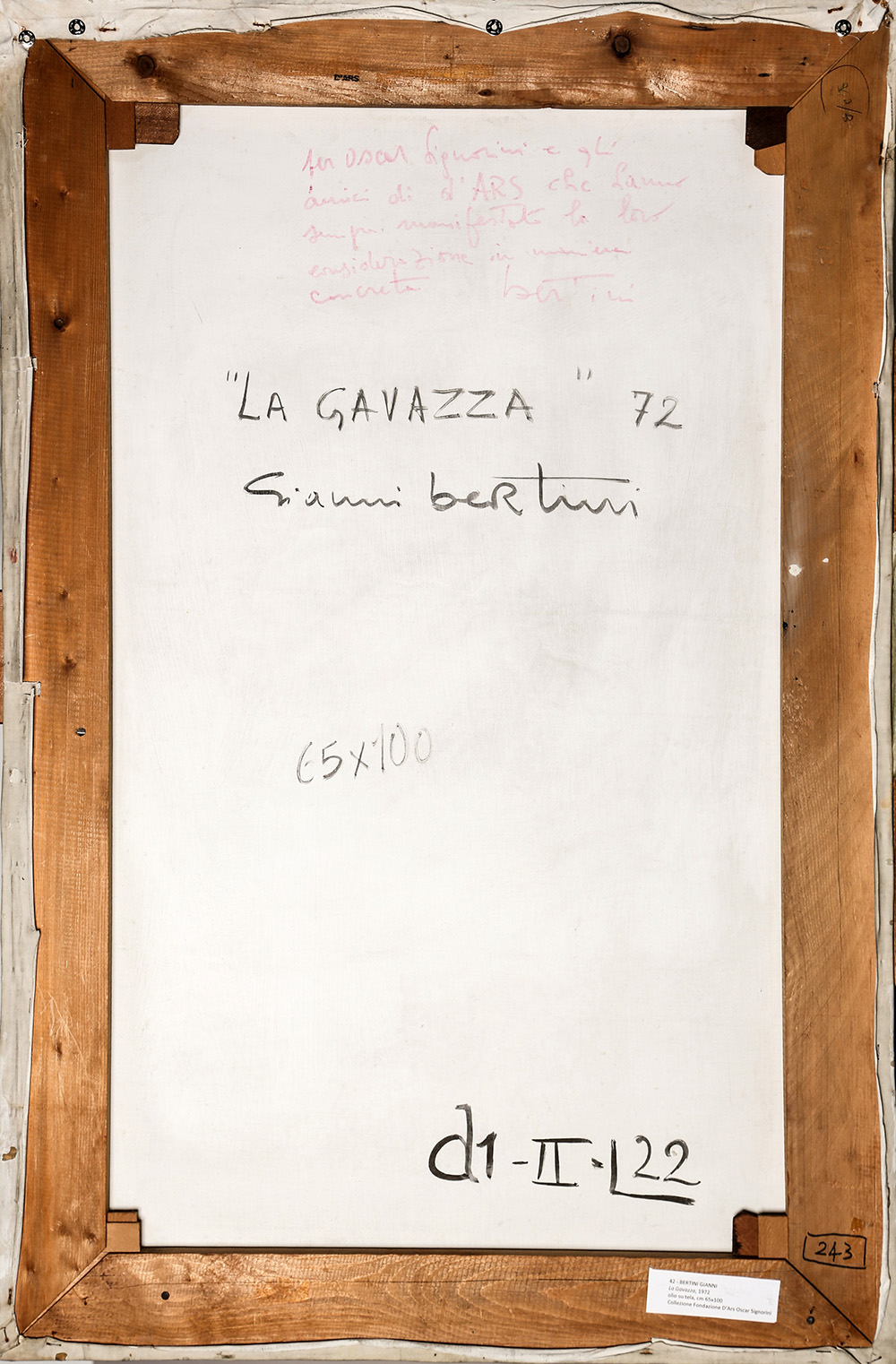 GIANNI BERTINI 1922 - 2010 La Gavazza, 1972 Tecnica mista su tela emulsionata, cm. 100 x 65 Firmato e datato in basso a destra Dedica dell’artista sul retro Etichetta Collezione Fondazione D’Ars Oscar Signorini, sul retro Timbro D’Ars, Milano sul retro L’opera ha subito un restauro nella parte alta Prov. Collezione Privata