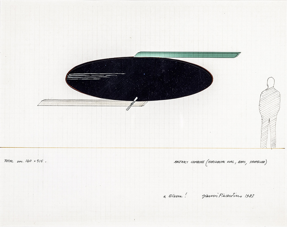 GIANNI PIACENTINO 1945 Abstract combine (horizontal oval, bars, propeller), 1983 Tecnica mista su carta, cm. 23 x 30 Firmato e datato in basso a destra Dedica dell’artista in basso Prov. Collezione Privata