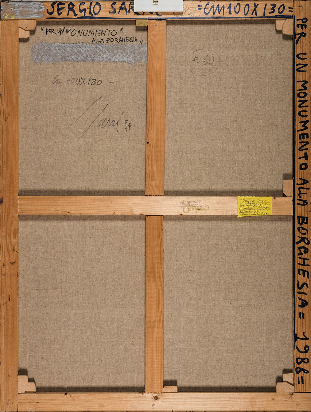 SERGIO SARRI 1938 Per un monumento alla borghesia, 1988 Acrilico su tela, cm. 130 x 100 Firmato e datato sul retro Etichetta e timbro Studio f.22 modern art gallery, Palazzolo sull’Oglio sul retro PUBBLICAZIONI: “Sergio Sarri - opere dal 1964 al 2008 - Catalogo ragionato”, Overtime Art, 2009, p. 266 n. 708 Prov. Collezione Privata