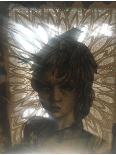 Niko D'Accolti malinconici chiarori.’’ pirografia,china e fori su carta applicata su tela,retroilluminata autentica dell'artista su foto