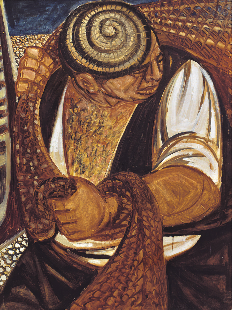 GIUSEPPE MIGNECO Messina 09/02/1908 - Milano 28/02/1997  Pescatore, 1958 olio su tela cm. 81x60, opera non firmata, etichette della XXIX Biennale Internazionale d'Arte di Venezia 1958, opera visibile parzialmente nella fotografia pubblicata su Migneco catalogo generale volume II a pagina 15 (Saggi critici) dove Giuseppe Migneco e Felice Casorati brindano nella sala della XXIX Biennale d'Arte di Venezia del 1958, opera riprodotta nella fotografia pubblicata su Migneco catalogo generale volume IV a pagina 13 (Saggi critici) Giuseppe Migneco nella sala a lui dedicata alla Biennale di Venezia, 1958.