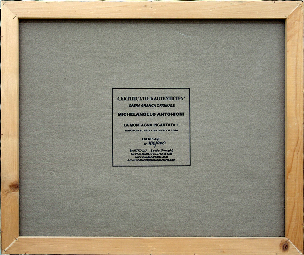 Michelangelo Antonioni 1912, Ferrara (Fe) - 2007, Roma (Rm) - [Italia] La montagna incantata 1 serigrafia su tela 60x71 cm es. 100/200; firma dell'artista in basso a destra certificato di autenticità della Artitalia di Spello sul retro