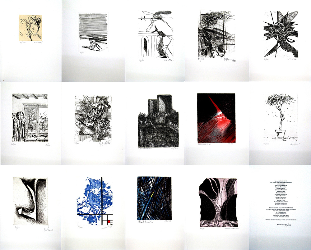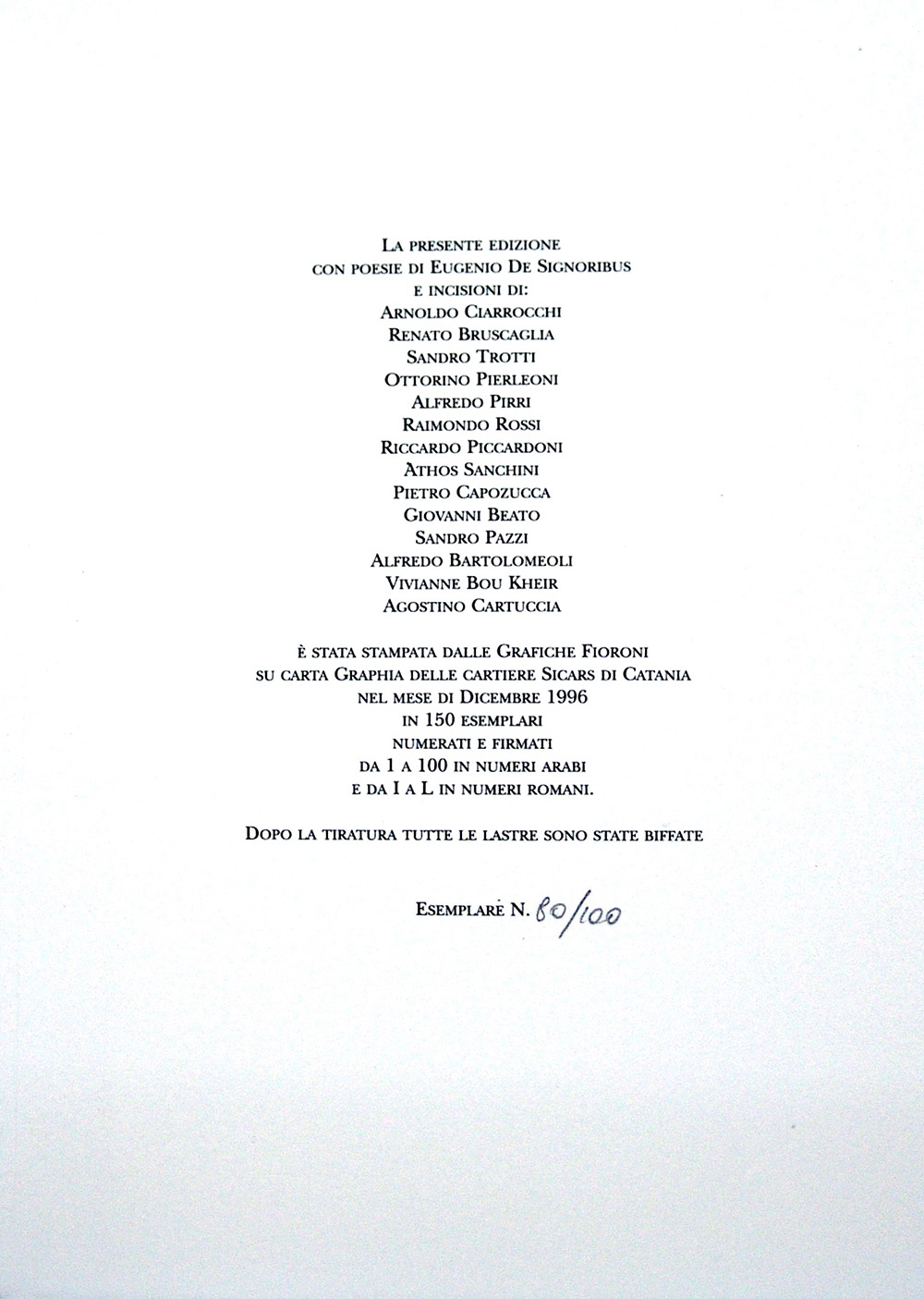 Alfredo Bartolomeoli, Giovanni Beato, Vivianne Bou Kheir, Renato Bruscaglia, Pietro Capozucca, Agostino Cartuccia, Arnaldo Ciarrocchi, Sandro Pazzi, Riccardo Piccardoni, Ottorino Pierleoni, Alfredo Pirri, Raimondo Rossi, Athos Sanchini, Sandro Trotti Ariette occidentali acquaforte 25x17 cm cad. 1996 es. 80/100; n. 14 acqueforti firmate a mano dagli artisti; edizione Grafiche Fioroni di Casette d'Ete a cura di Eugenio De Signoribus certificato di autenticità Picenum