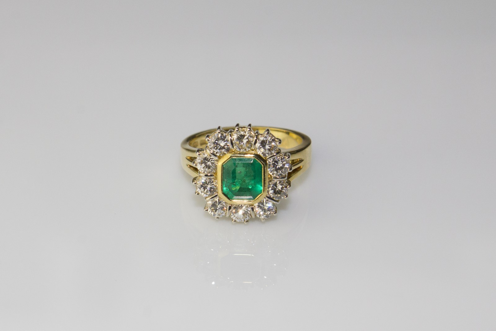 [Nessun Autore] Gold ring with emerald and diamonds . . . Yellow and white gold ring, total gr 9.30. Diamonds cts 1 approx and colombian emerald cts 0.75 approx.