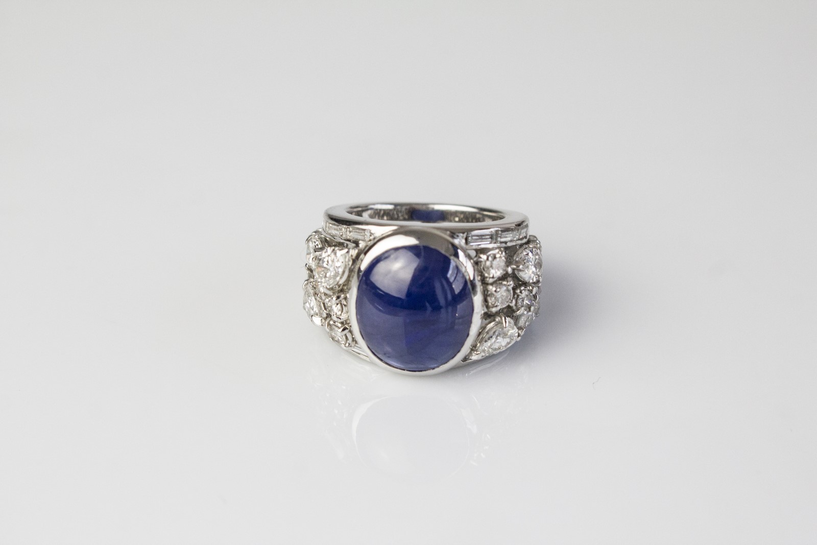 [Nessun Autore] Gold ring with sapphire and diamonds. . . 18kt white gold ring with mixed cut diamonds of total 14.20 gr. Central cabouchon sapphire of 10 cts approx. Diamonds 2 cts approx.