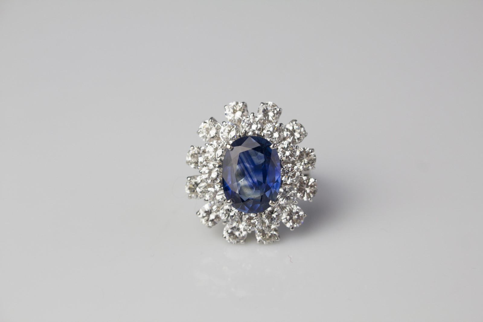 [Nessun Autore] Ring with saphire and diamonds. . . Ring with oval sapphire cts 5.52 and ouit ouit diamonds cts 3.50