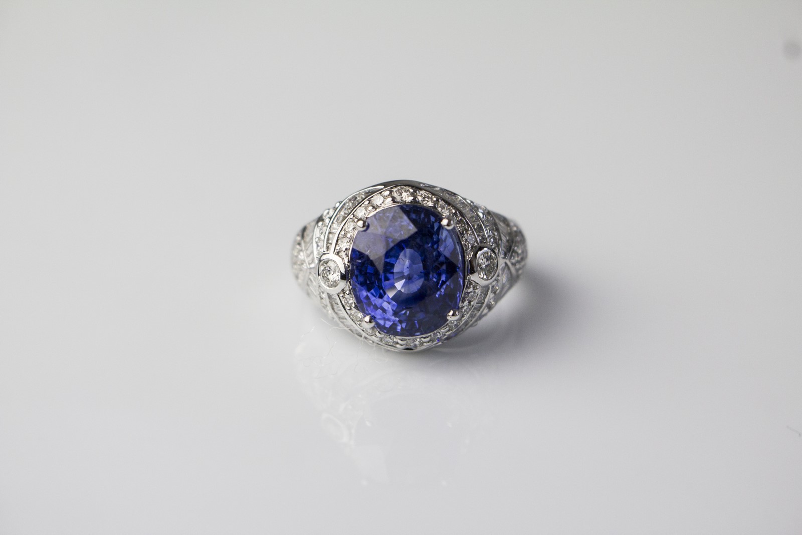 Anello in oro con diamanti e zaffiro . . . Anello in oro bianco di gr 10.8 e diamanti per circa 3 carati e uno zaffiro ceylon di cts 8.04
