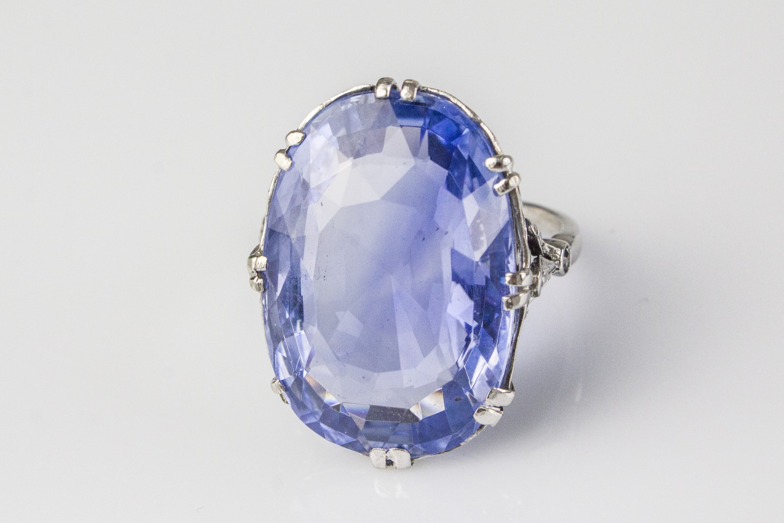 [Nessun Autore] Gold ring with sapphire. . . 18kt white gold ring, 14.93 gr with central ceylon sapphire cts 45.95 with no indications of heating