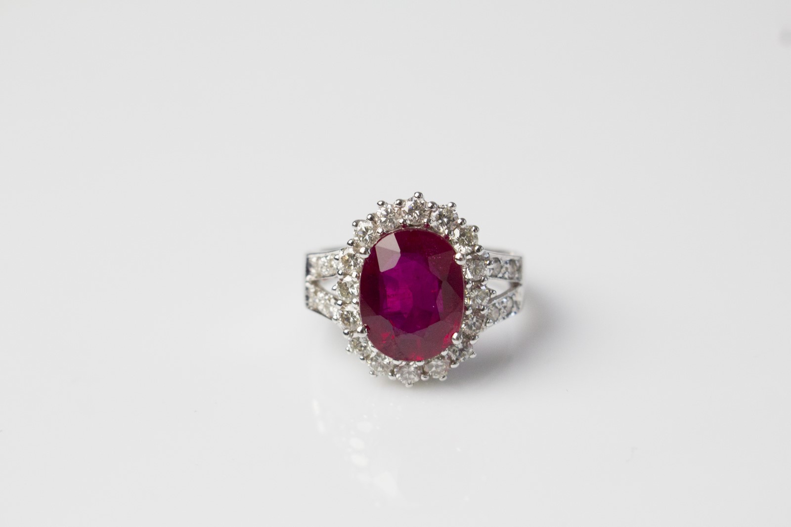 [Nessun Autore] 18kt white gold, gr 7 total. Diamonds cts 0.92. Glass filled Natural ruby cts 7.2. . .