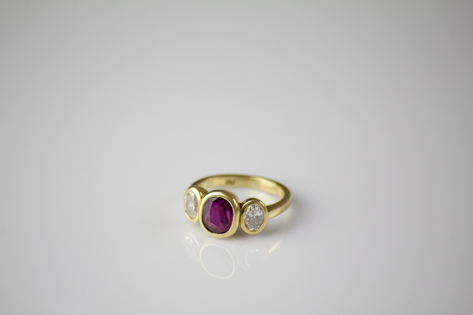 [Nessun Autore] 18kt yellow gold ring, gr 6. Ruby cts 1.90. Two oval diamonds on the sides cts 0.40. . . .