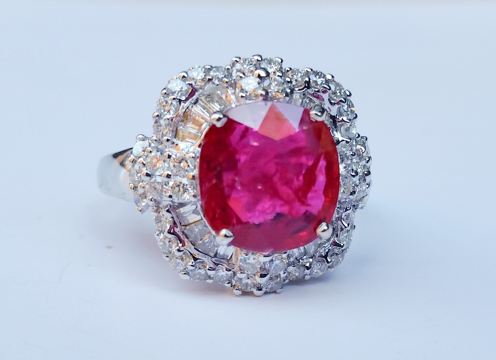 [Nessun Autore] Gold ring with ruby and diamonds . . . White gold ring, 4.79 gr with central burma ruby with no indication of heating, Certificate GRS cts 3.83 and diamonds cts 1.03