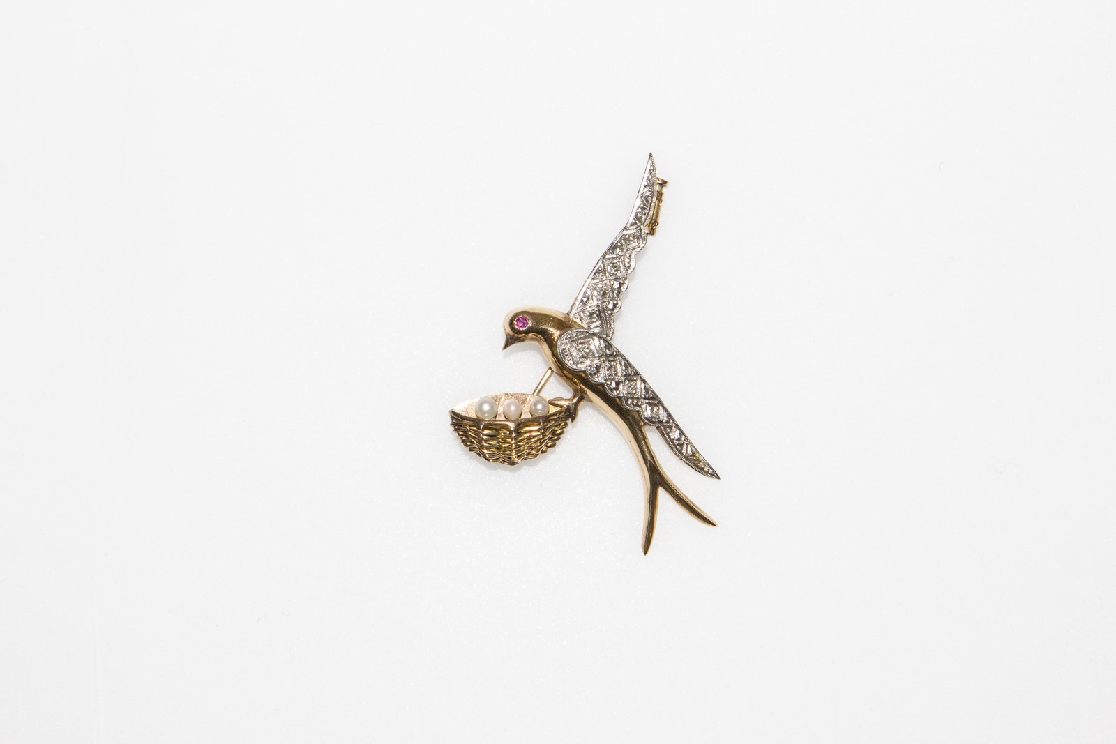 [Nessun Autore] Gold dove shape brooch with diamonds. . . Gold dove shape brooch, 6.2 total gr with oui oui diamonds cts 0.09, one ruby and three cultured pearls