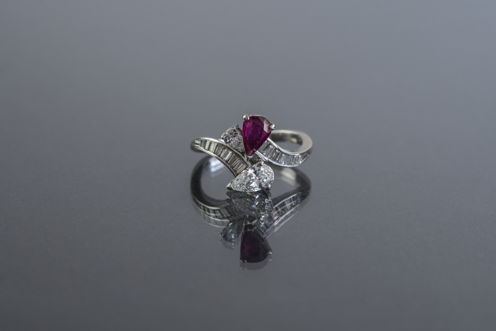 [Nessun Autore] 18kt gold contrarié ring, gr 3.90, with pear shape diamond cts 0.50 approx. Baguettes diamonds cts 0.70 and pear shape ruby cts 0.88. . .