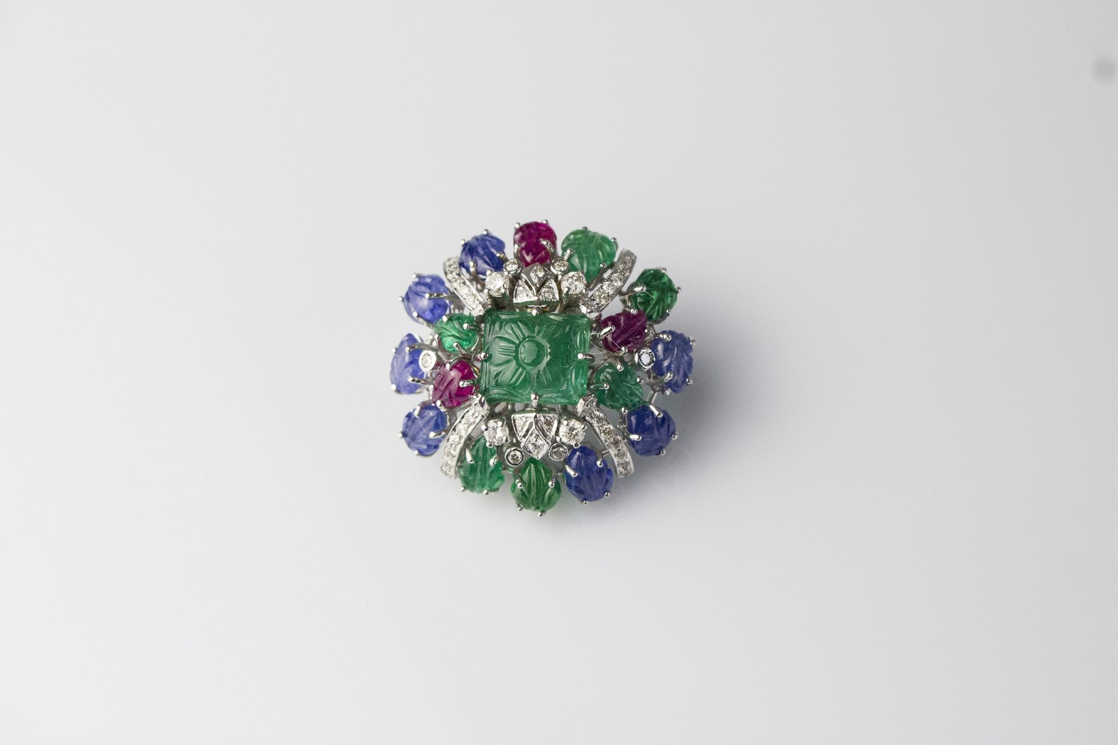 [Nessun Autore] Brooch with diamonds, sapphires, rubies and emeralds. . . Tutti Frutti white gold brooch, 15.20 total gr. Diamonds cts 0.82. Emeralds, rubies and carved sapphires cts 12.53.