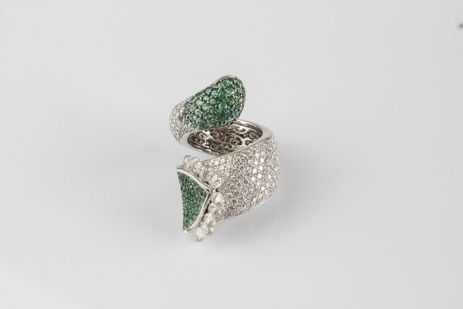 [Nessun Autore] Gold ring with diamonds and emeralds. . . White gold ring, gr 20.6. Brilliant cut diamonds cts 4.79. Briolette cut diamonds cts 4.30
