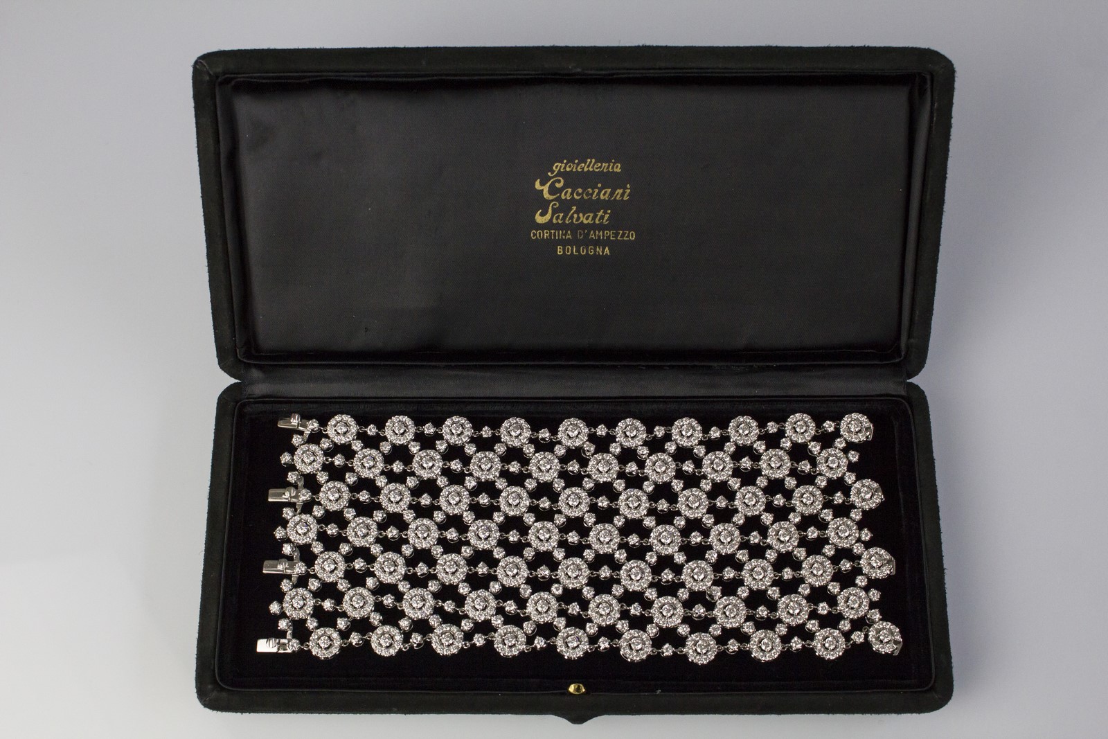 Parure di orecchini e bracciale in diamanti . . . Parure composta da un paio di orecchini chandelier in oro bianco e diamanti di grammi 57.5 ed un bracciale in oro bianco di grammi complessivi 148.3. I carati totali dei diamanti sono 62 circa.
