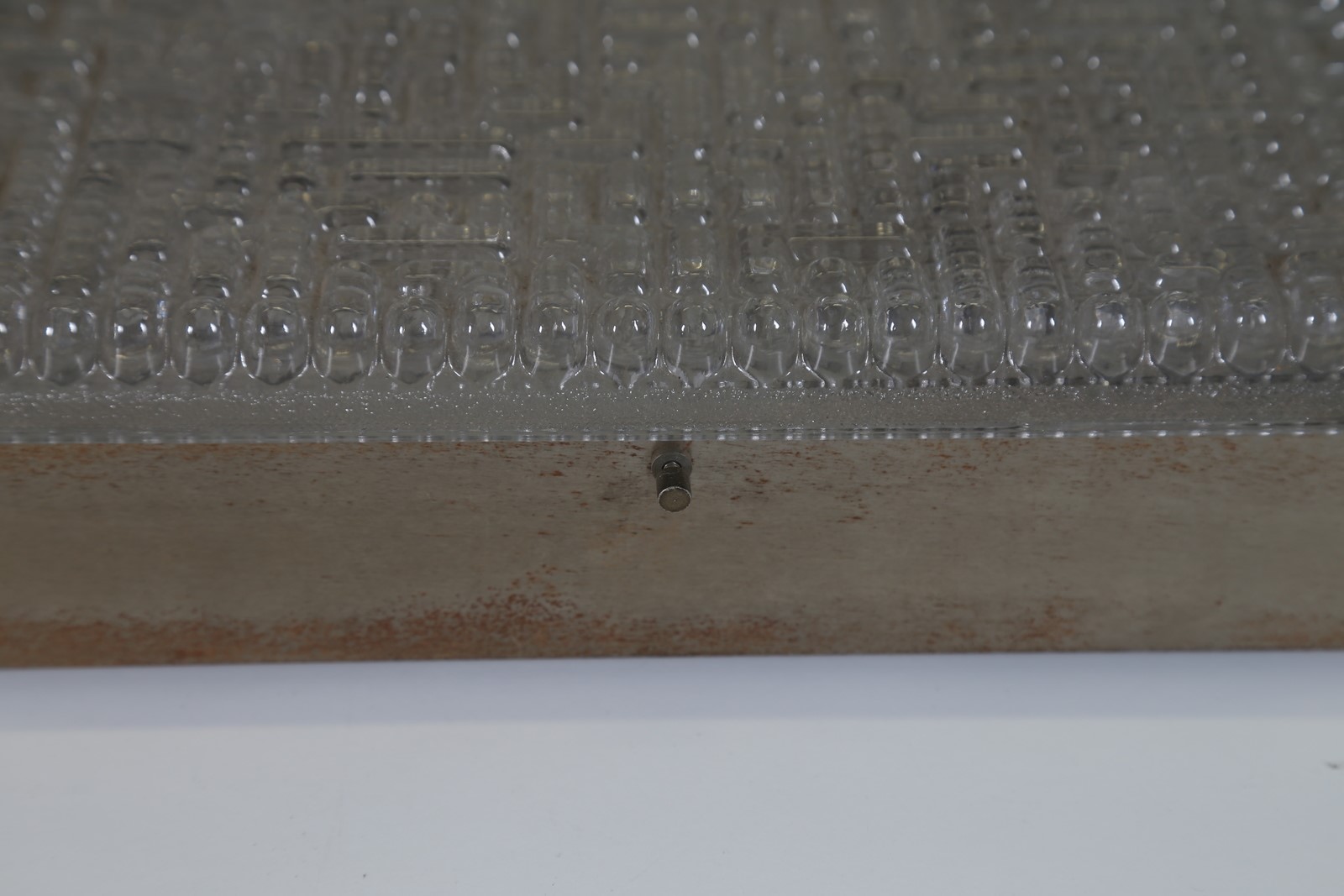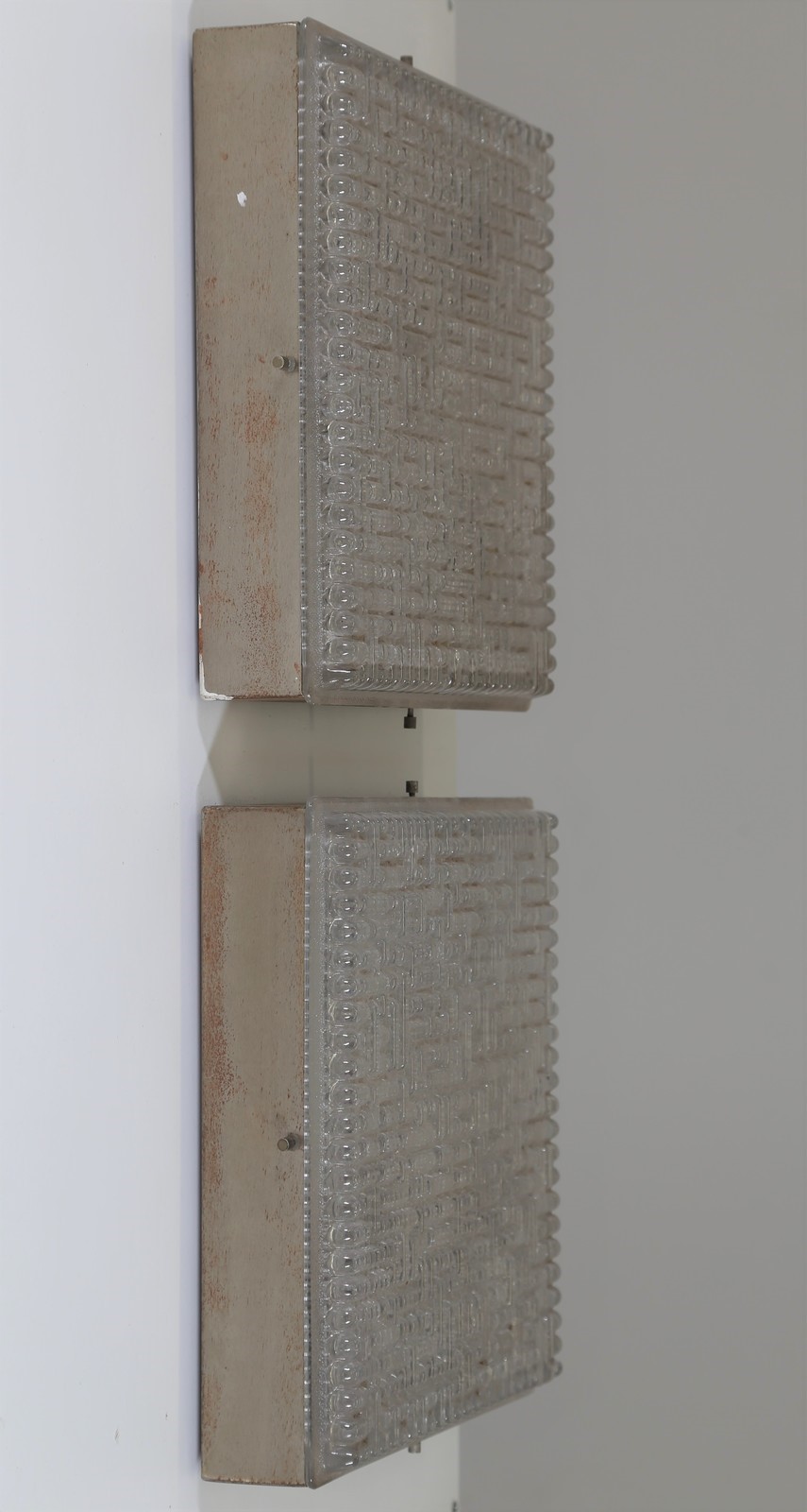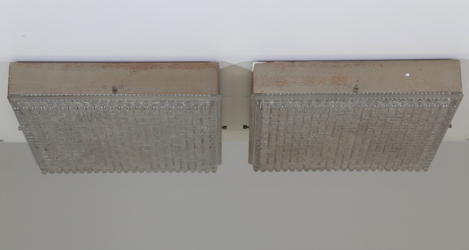 MANIFATTURA ITALIANA Coppia di plafoniere in metallo anodizzato e vetro. -. Cm 30,00 x 30,00 x 8,00.