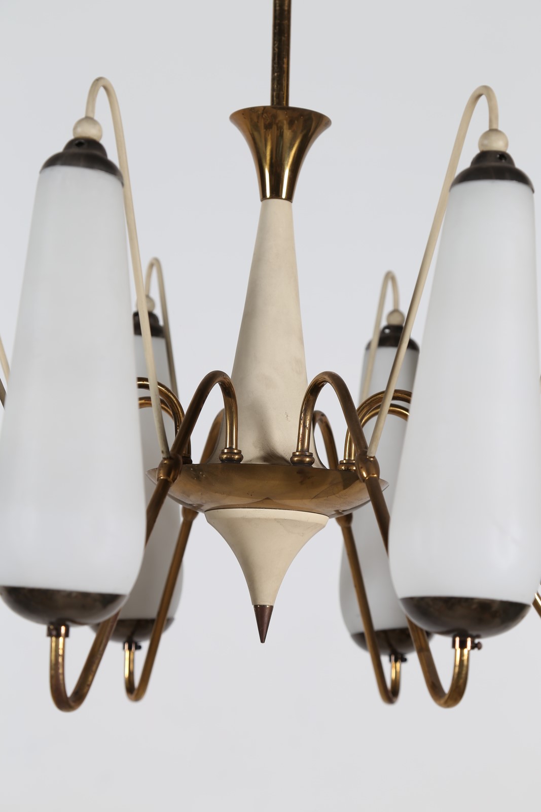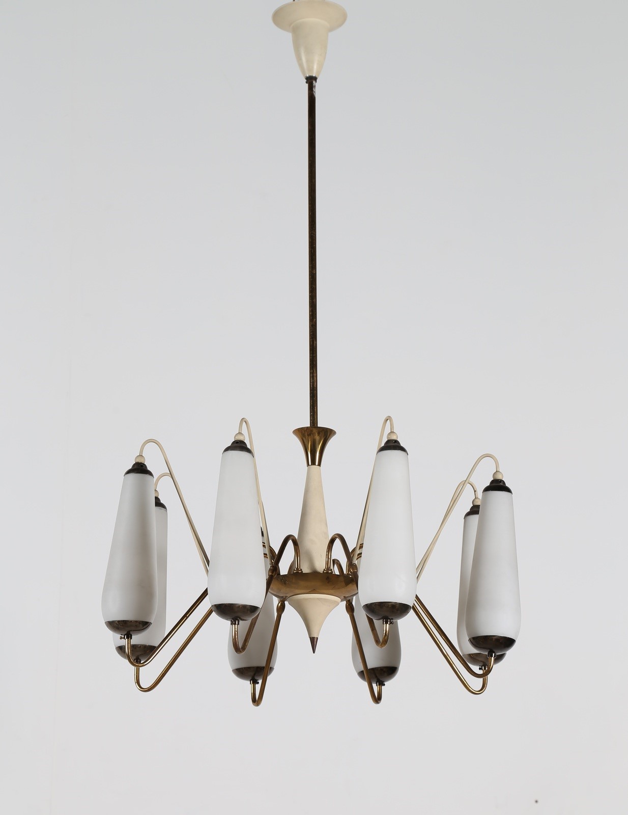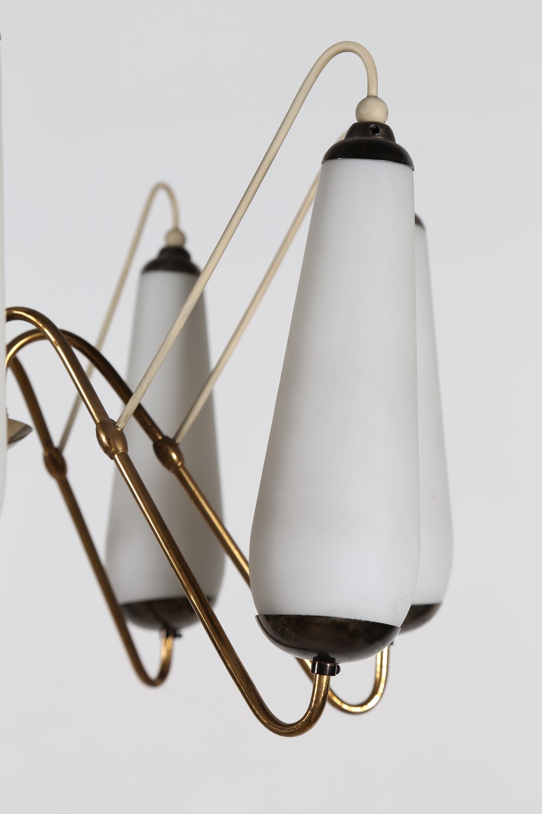 MANIFATTURA ITALIANA Lampadario in ottone metallo laccato e vetro opalino, anni 50. -. Cm 66,00 x 110,00 x 66,00.
