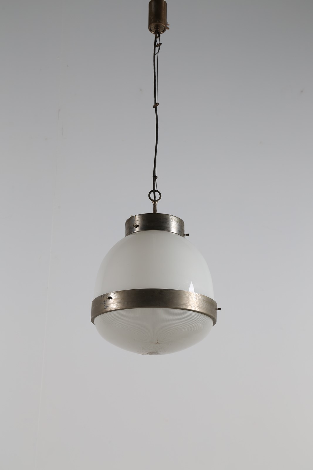 MAZZA SERGIO (n. 1931) Lampada a sospensione in ottone nichelato, vetro stampato e opalino, mod. Big Delta, per Artemide anni 60. Compasso d'oro. . Cm 37,00 x 115,00.