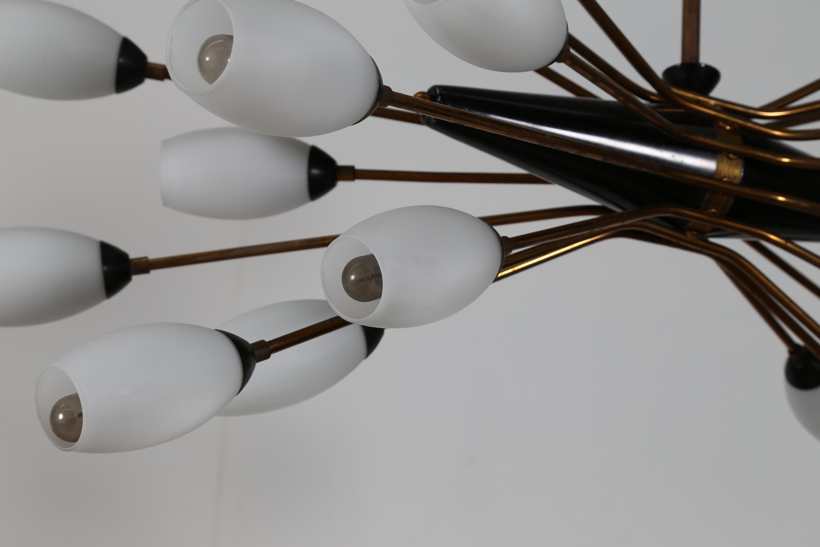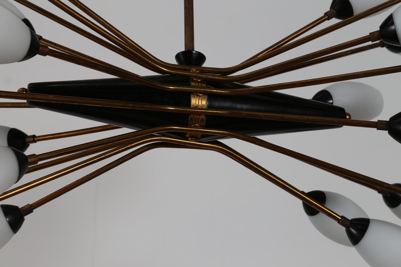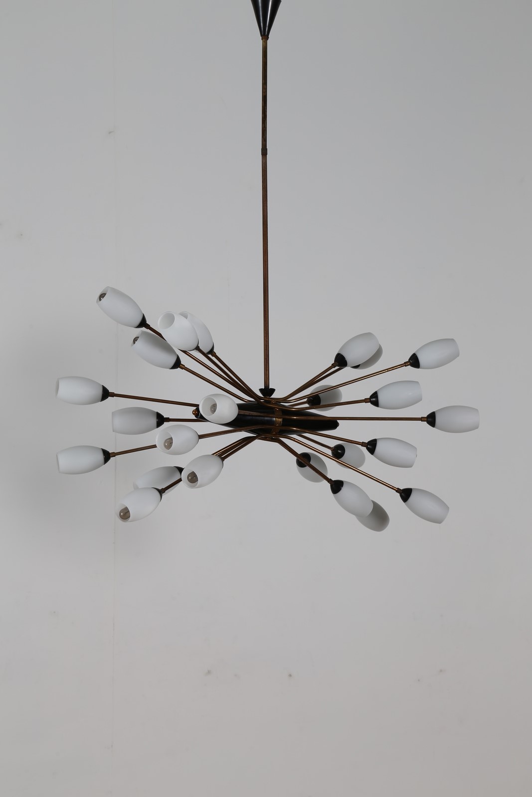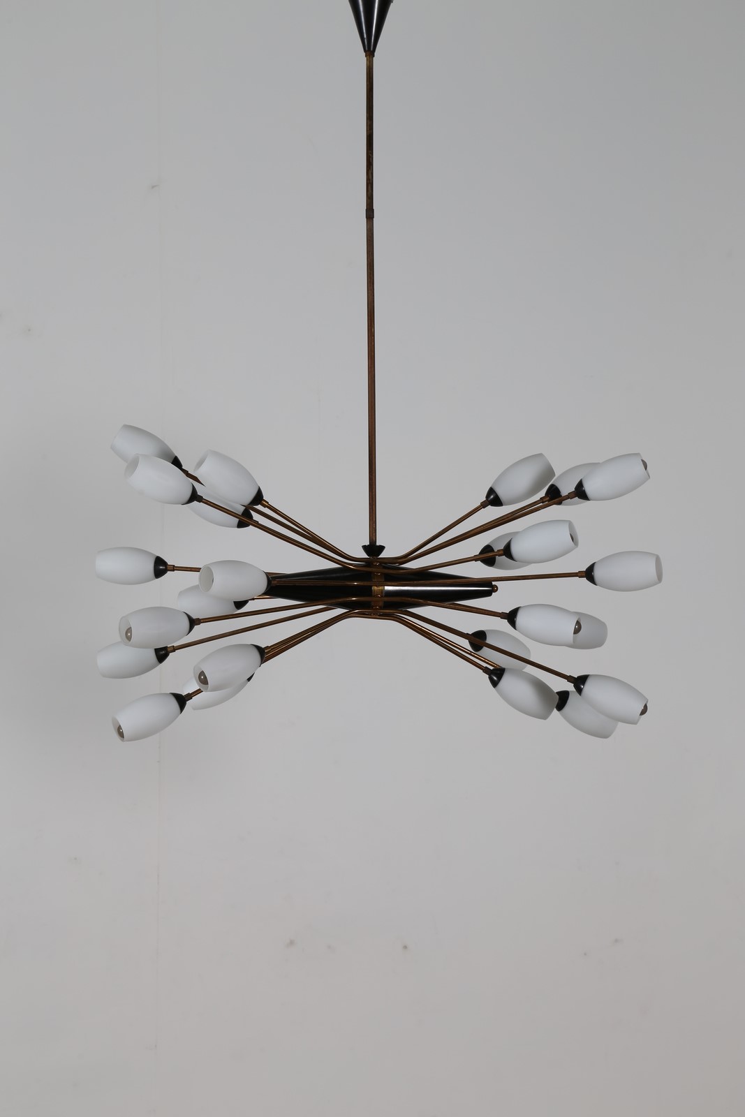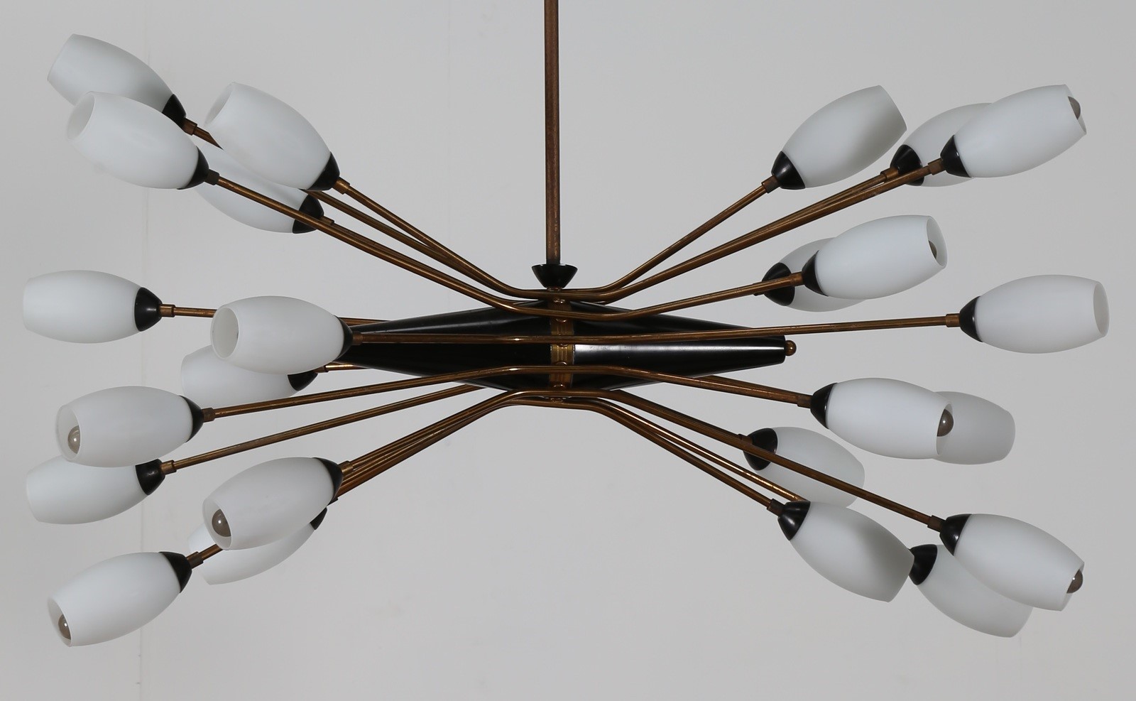 TORLASCO OSCAR Lampadario in ottone metallo laccato e vetro opalino per Lumi Milano anni 50. -. Cm 100,00 x 130,00 x 50,00.