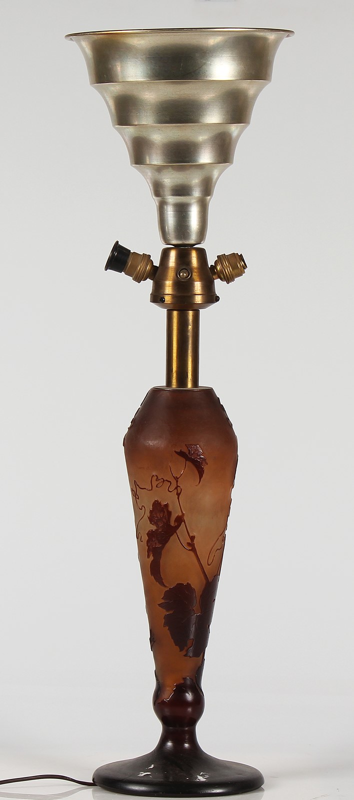 GALLE' EMILE (1846 - 1904) Lampada da tavolo in vetro decorato. . Cm 68,00.