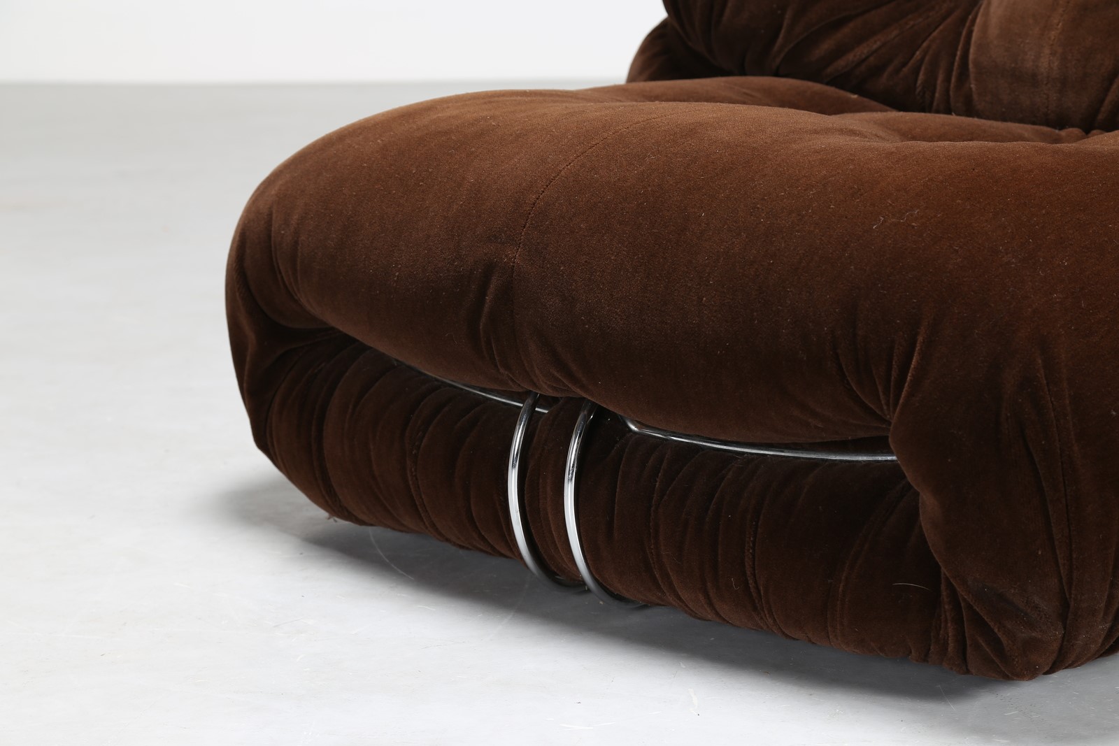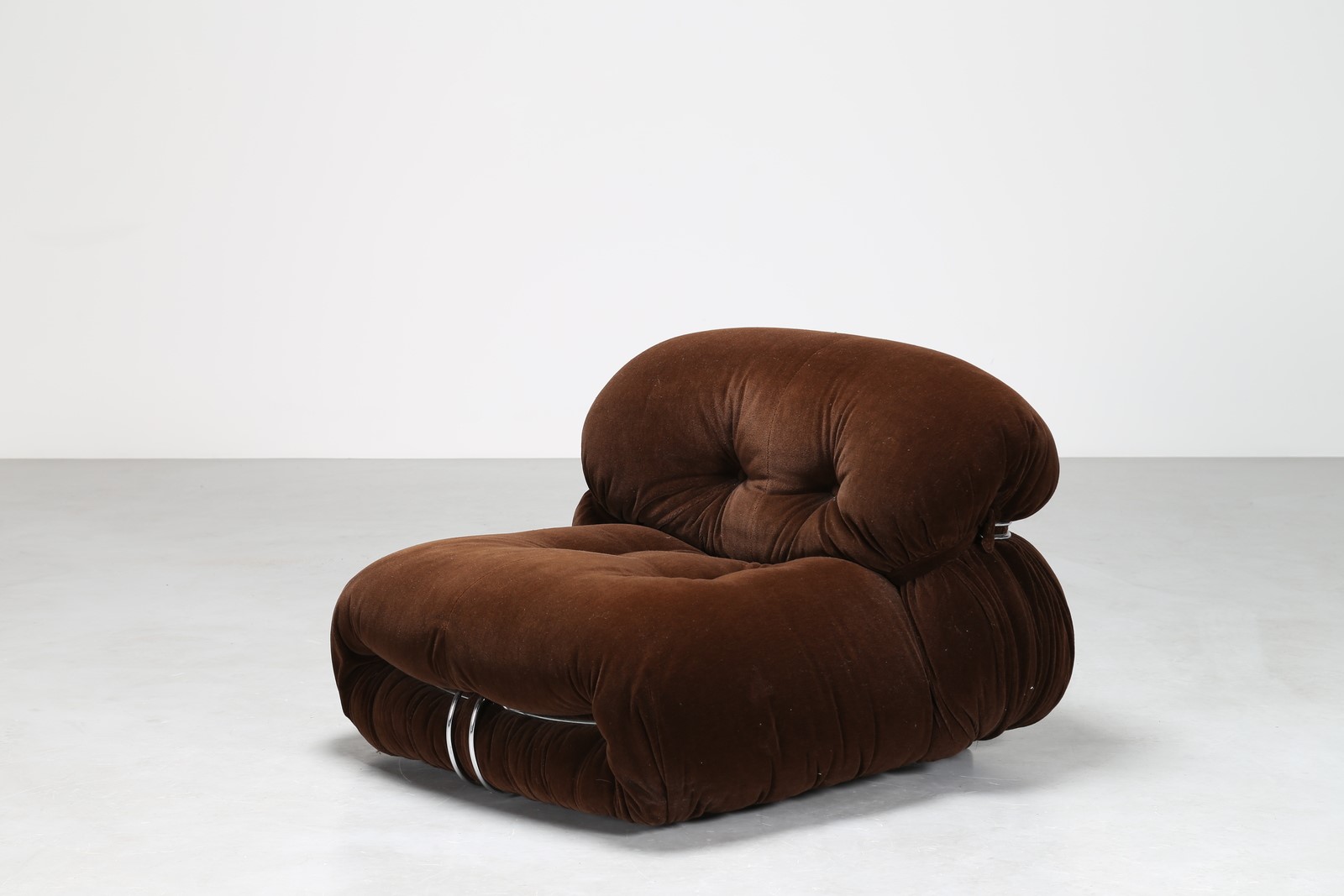 SCARPA AFRA & TOBIA Poltrona con struttura in metallo cromato e velluto, mod, Soriana, per Cassina, anni 70. -. Cm 103,00 x 65,00 x 105,00. Presente etichetta.