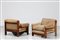 SAPORITI SERGIO Coppia poltrone in legno e tessuto originale, per F.lli Saporiti anni 70. Etichetta presente.