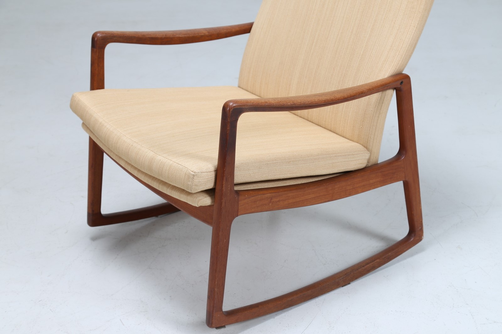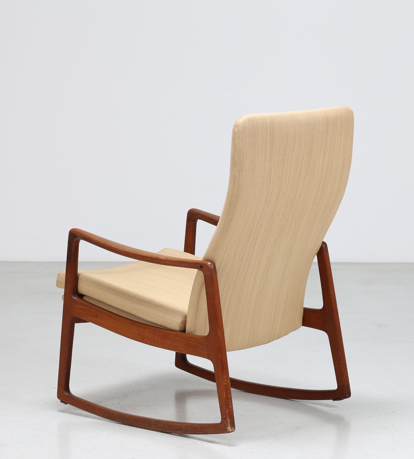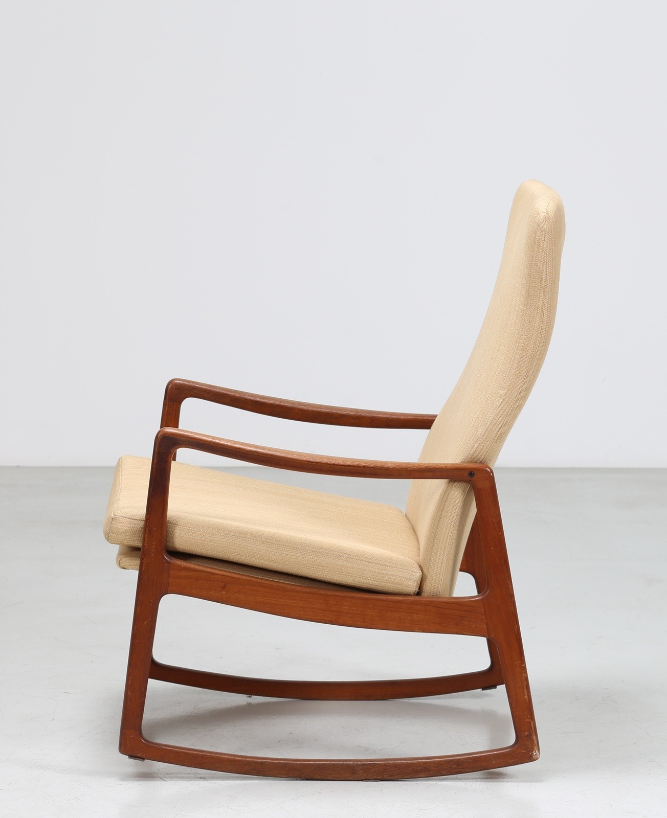WANSCHER OLE Sedia a dondolo in teak e tessuto, mod. 160, per France & Son...