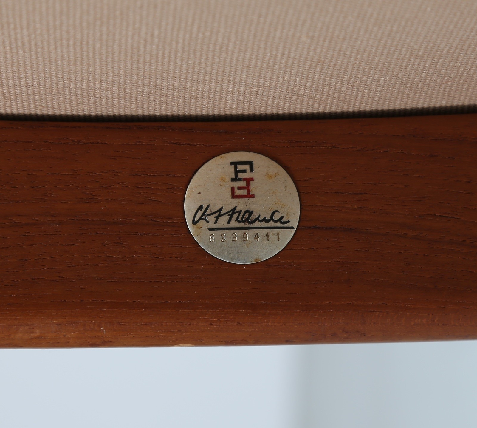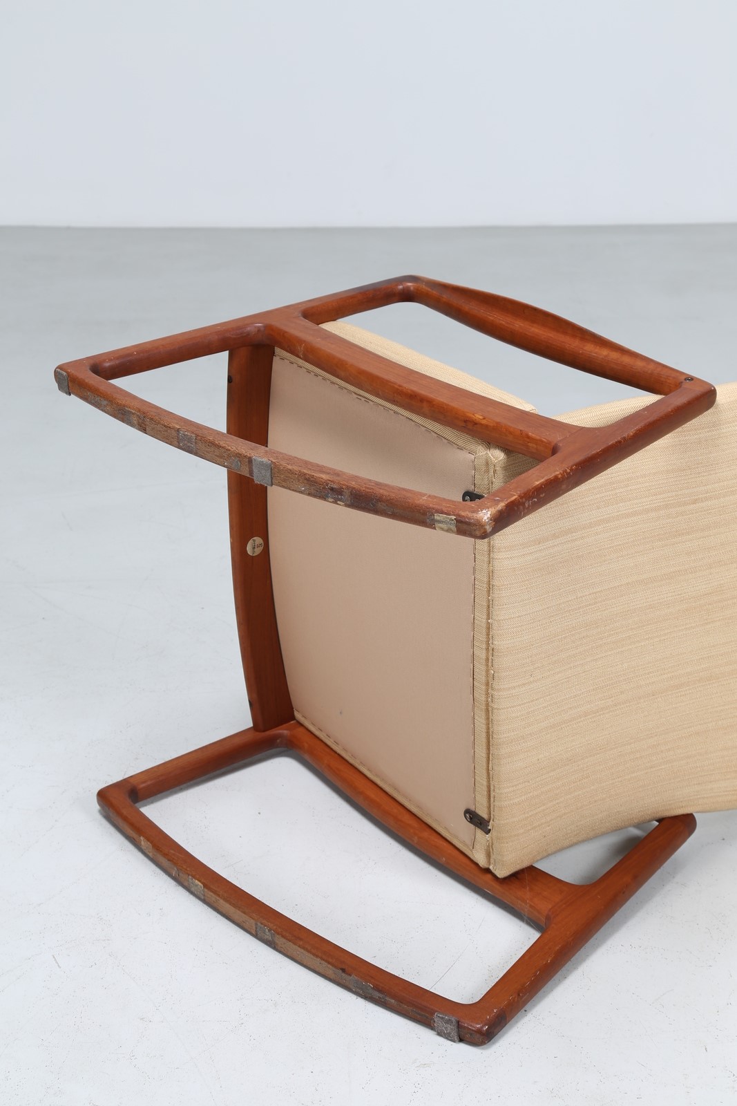 WANSCHER OLE Sedia a dondolo in teak e tessuto, mod. 160, per France & Son anni 50. Etichetta presente. -. Cm 67,00 x 98,00 x 80,00.