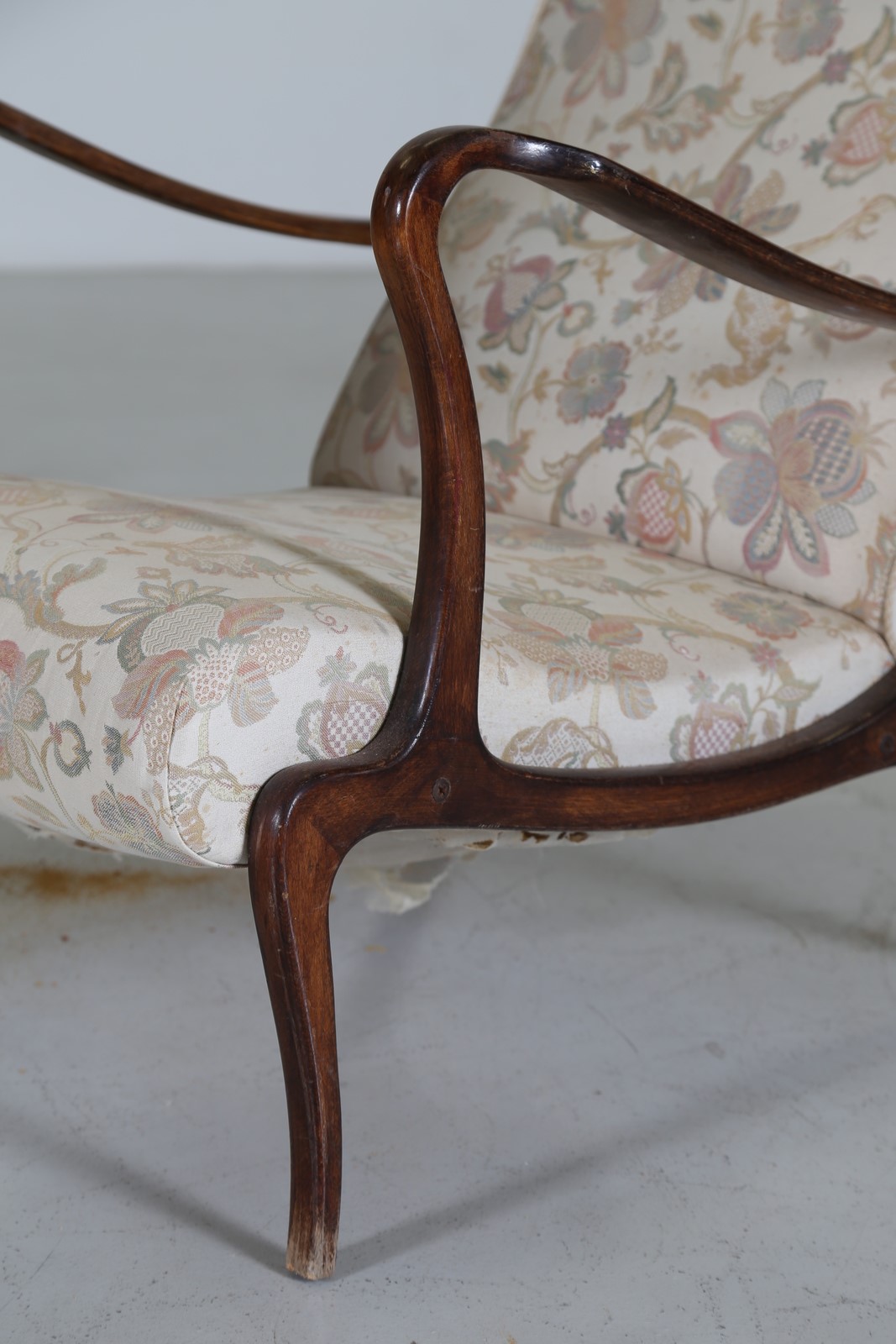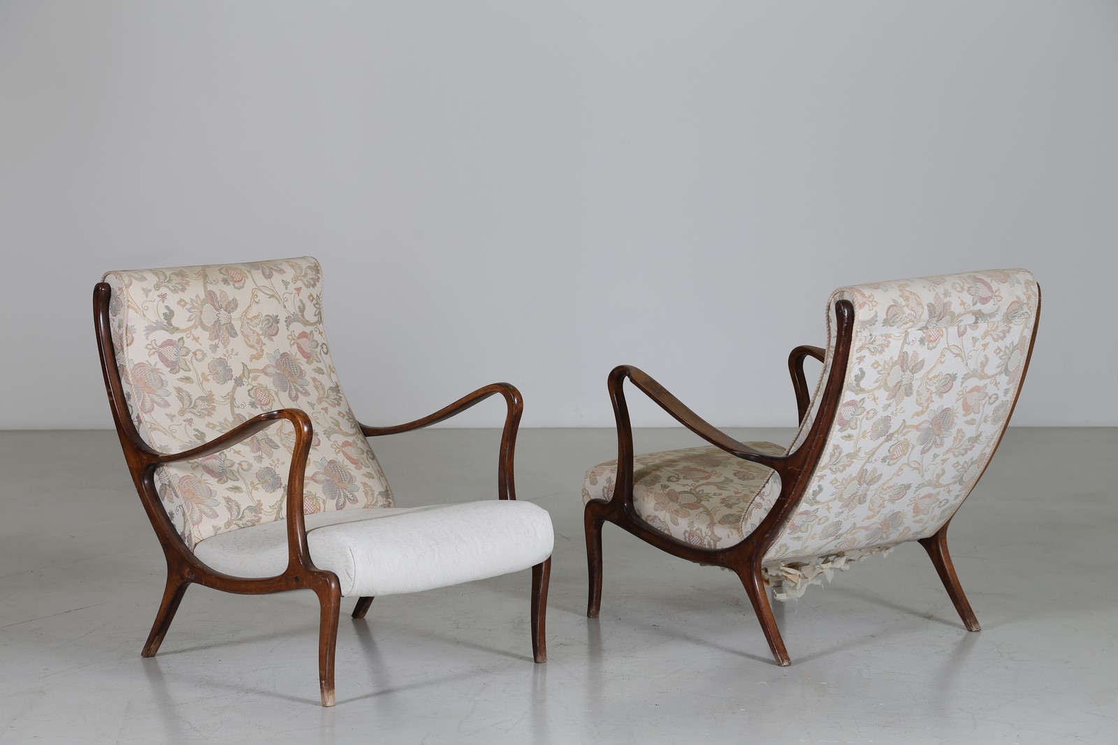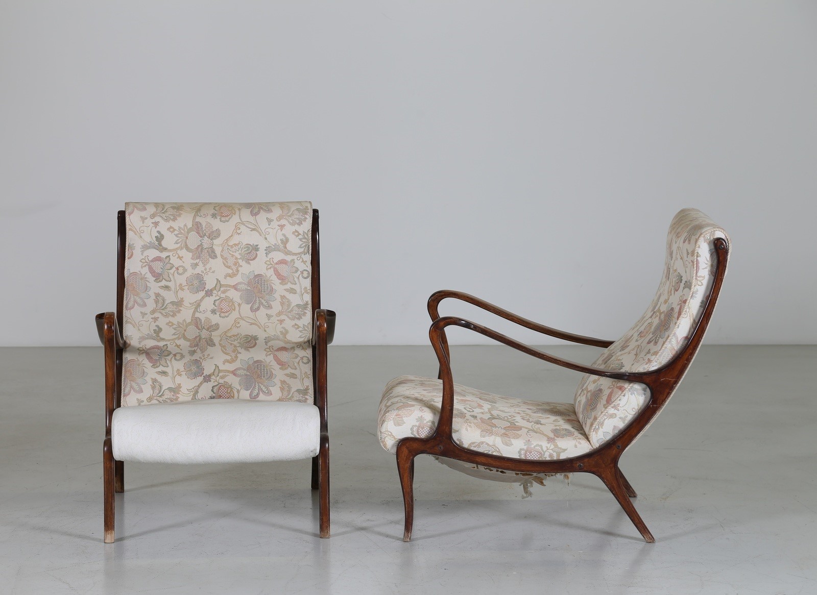 LONGHI EZIO Coppia di poltrone in legno e tessuto originale, mod. Mitzi per...