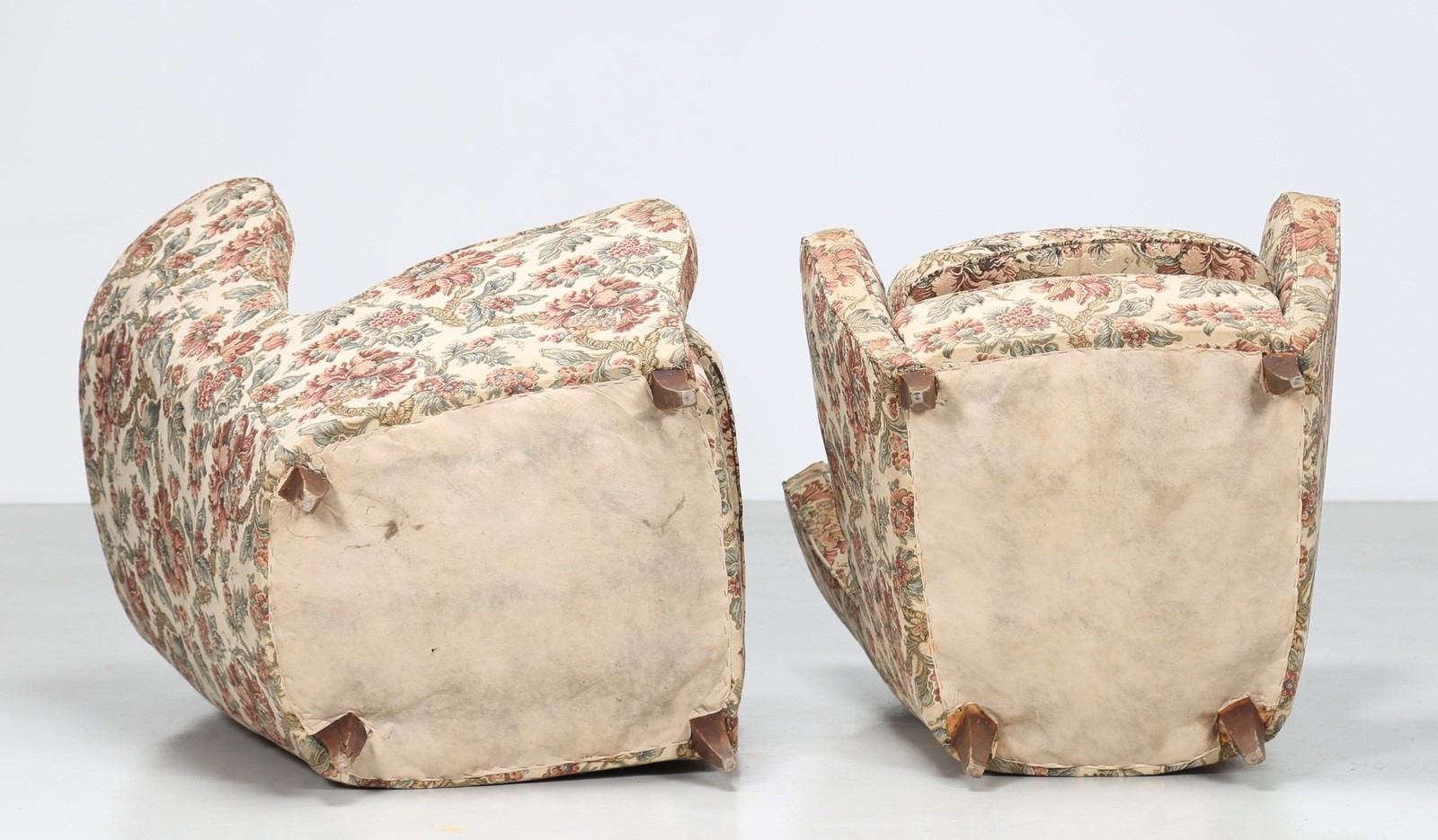 MANIFATTURA ITALIANA Coppia di poltrone in legno e tessuto originale, anni 40. -. Cm 80,00 x 103,00 x 86,00.