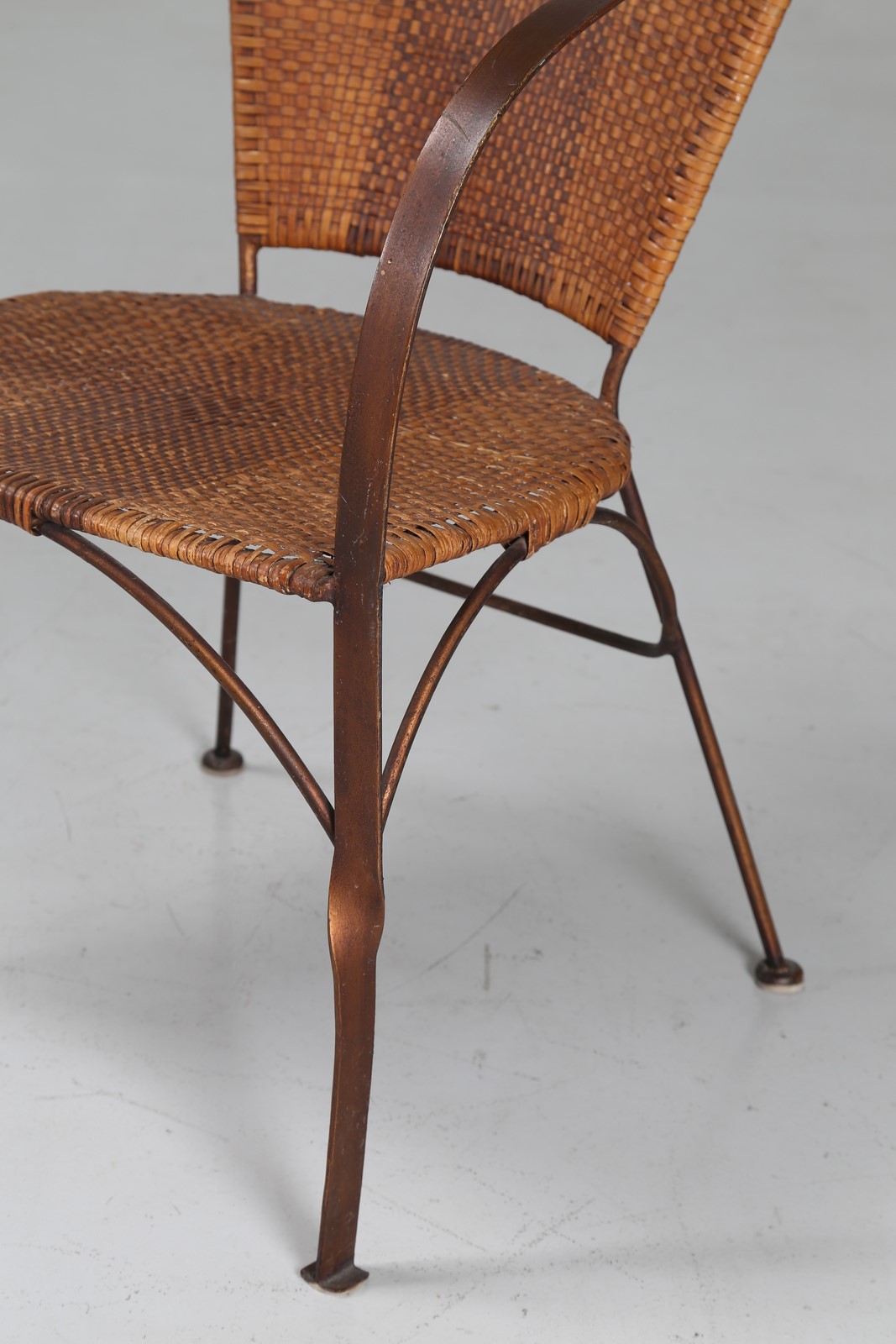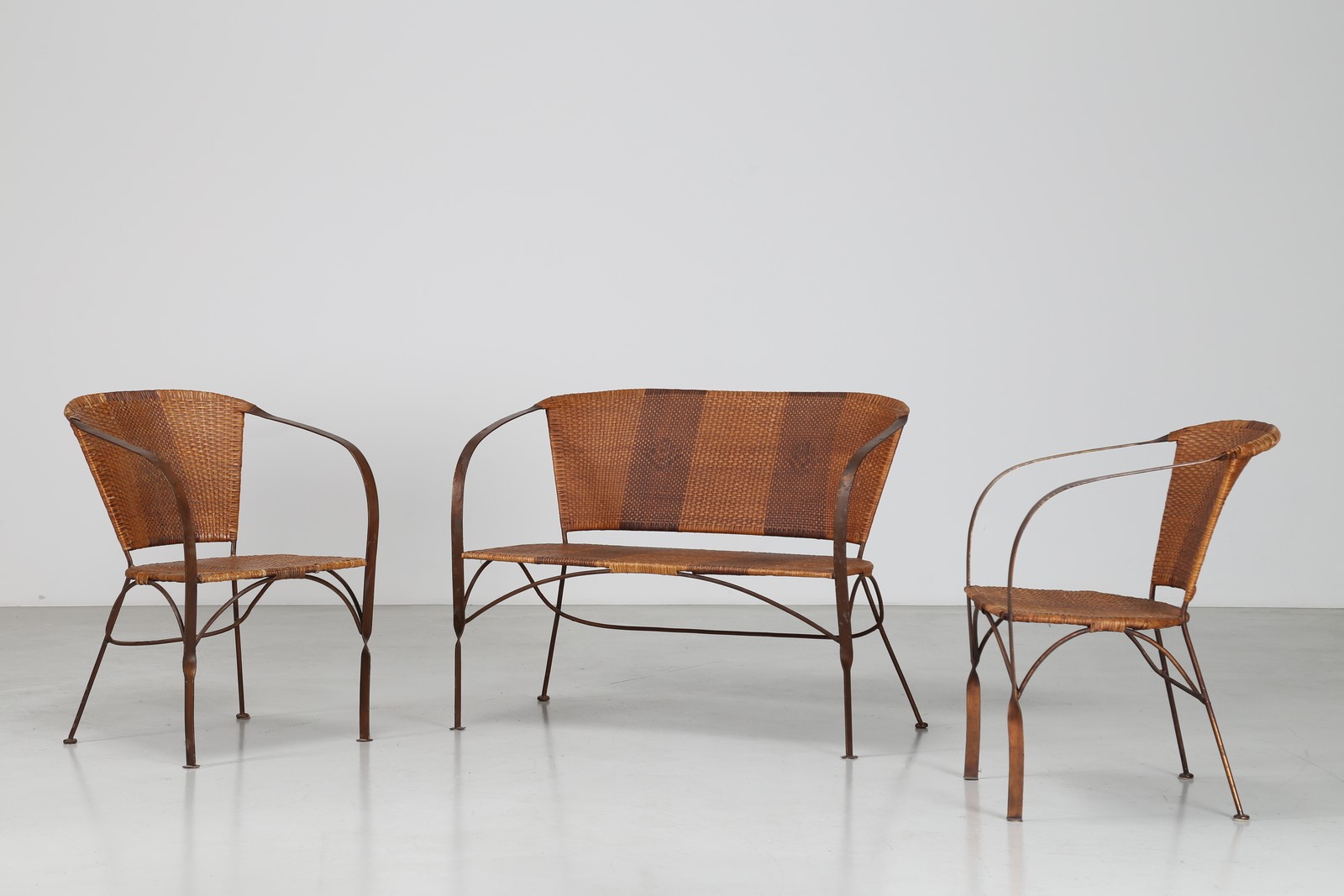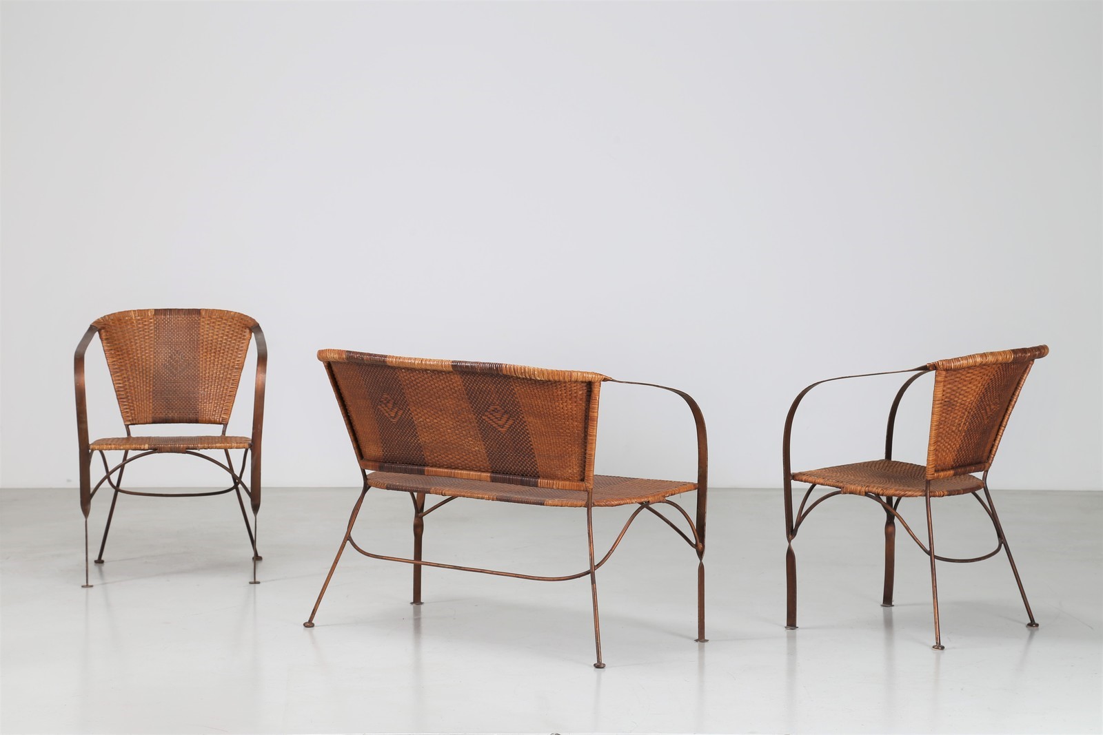 MANIFATTURA ITALIANA Un divanetto e due poltrone in ottone e midollino, anni...