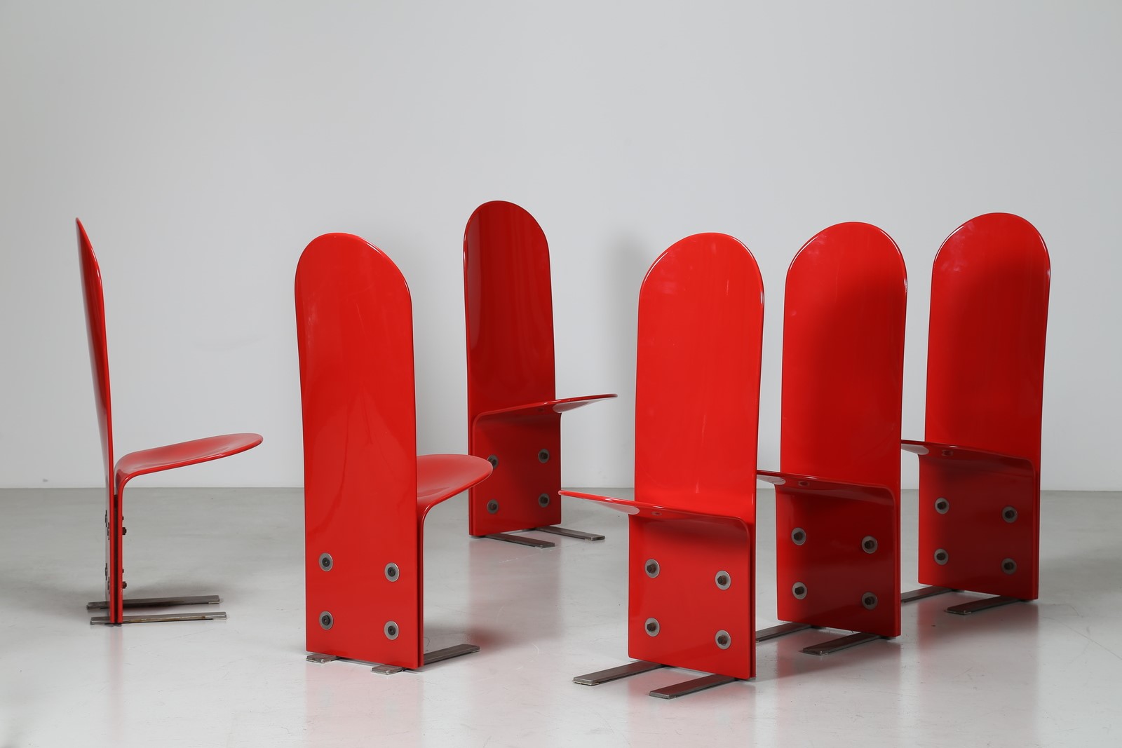 SACCARDO LUIGI Sei sedie in compensato curvo laccato rosso e metallo cromato,...