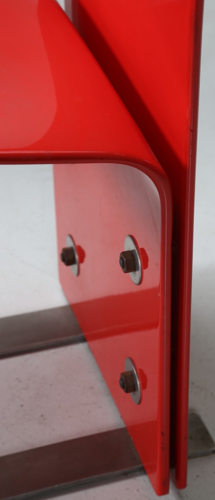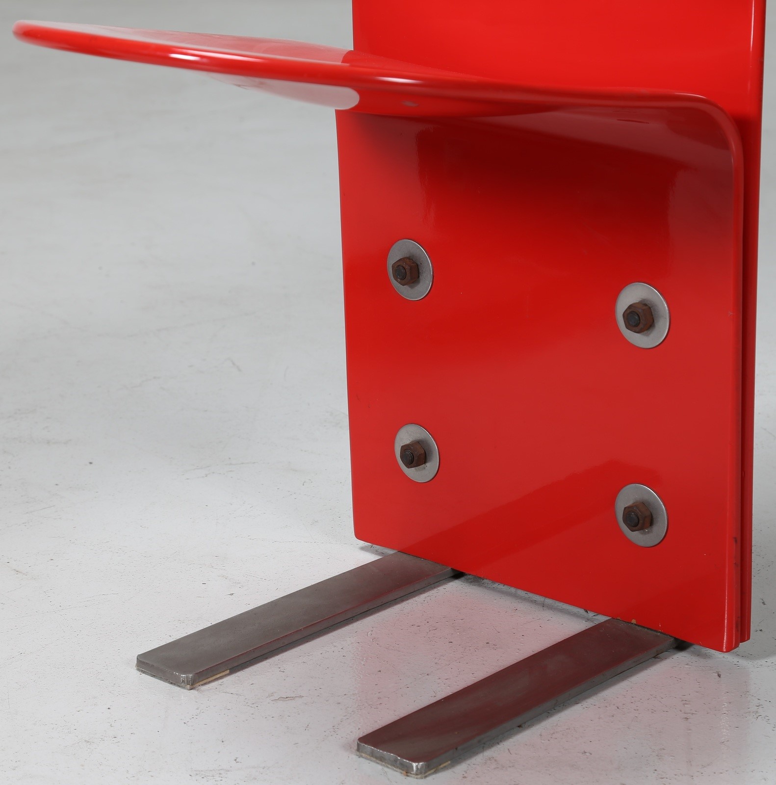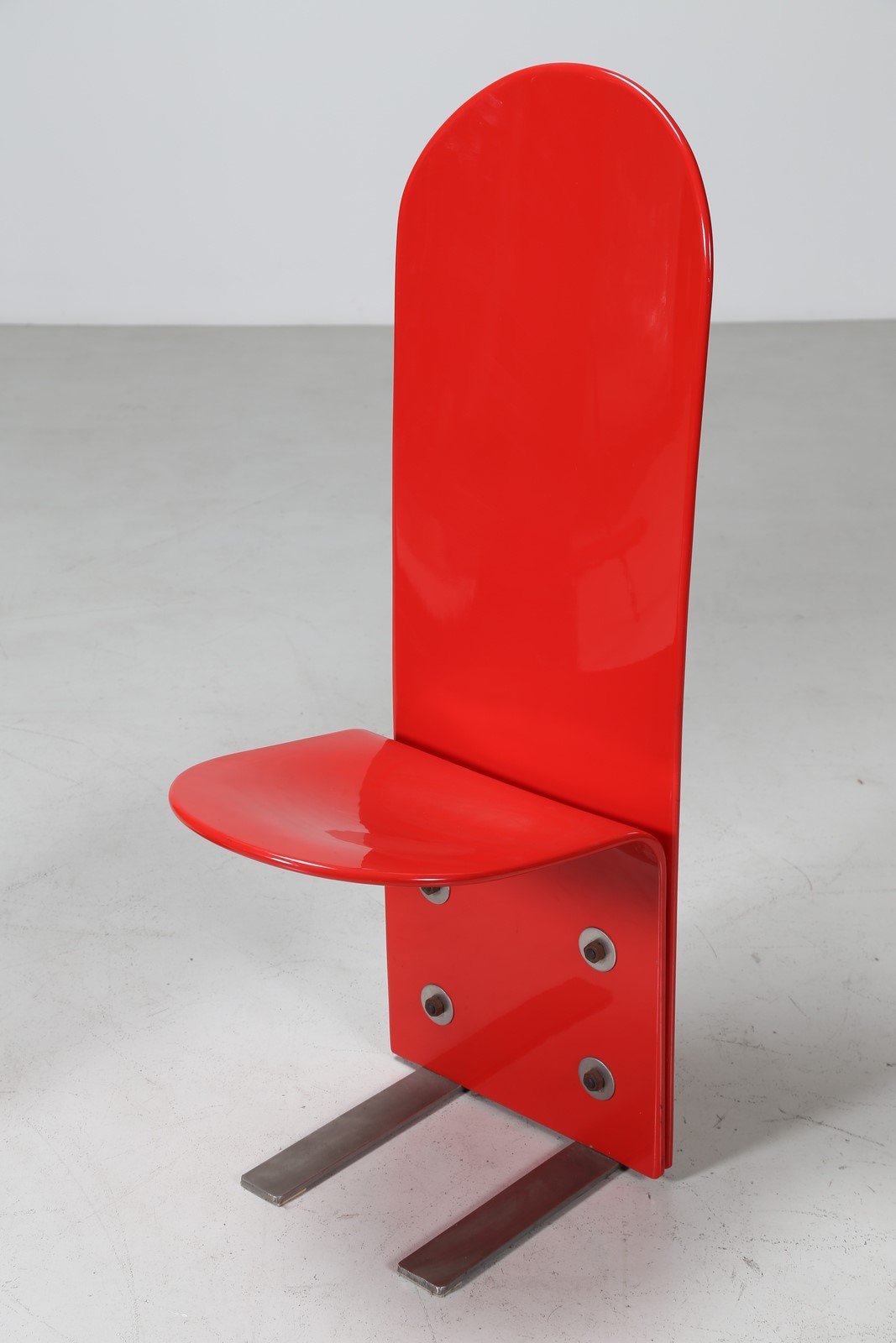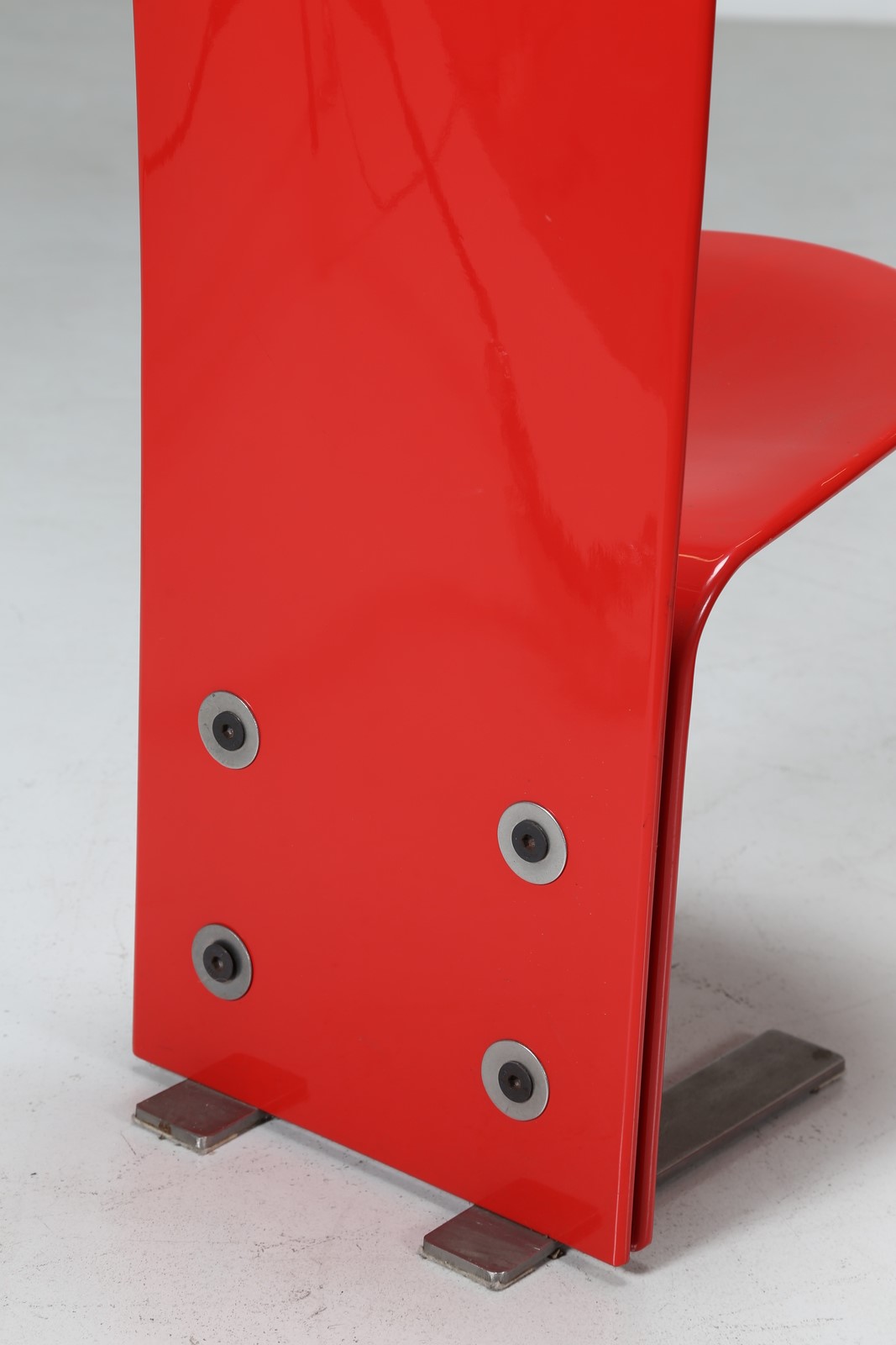 SACCARDO LUIGI Sei sedie in compensato curvo laccato rosso e metallo cromato, mod. Pellicano, anni 70. Provenienza eredi famiglia Saccardo. -. Cm 38,00 x 110,00 x 48,00.