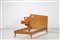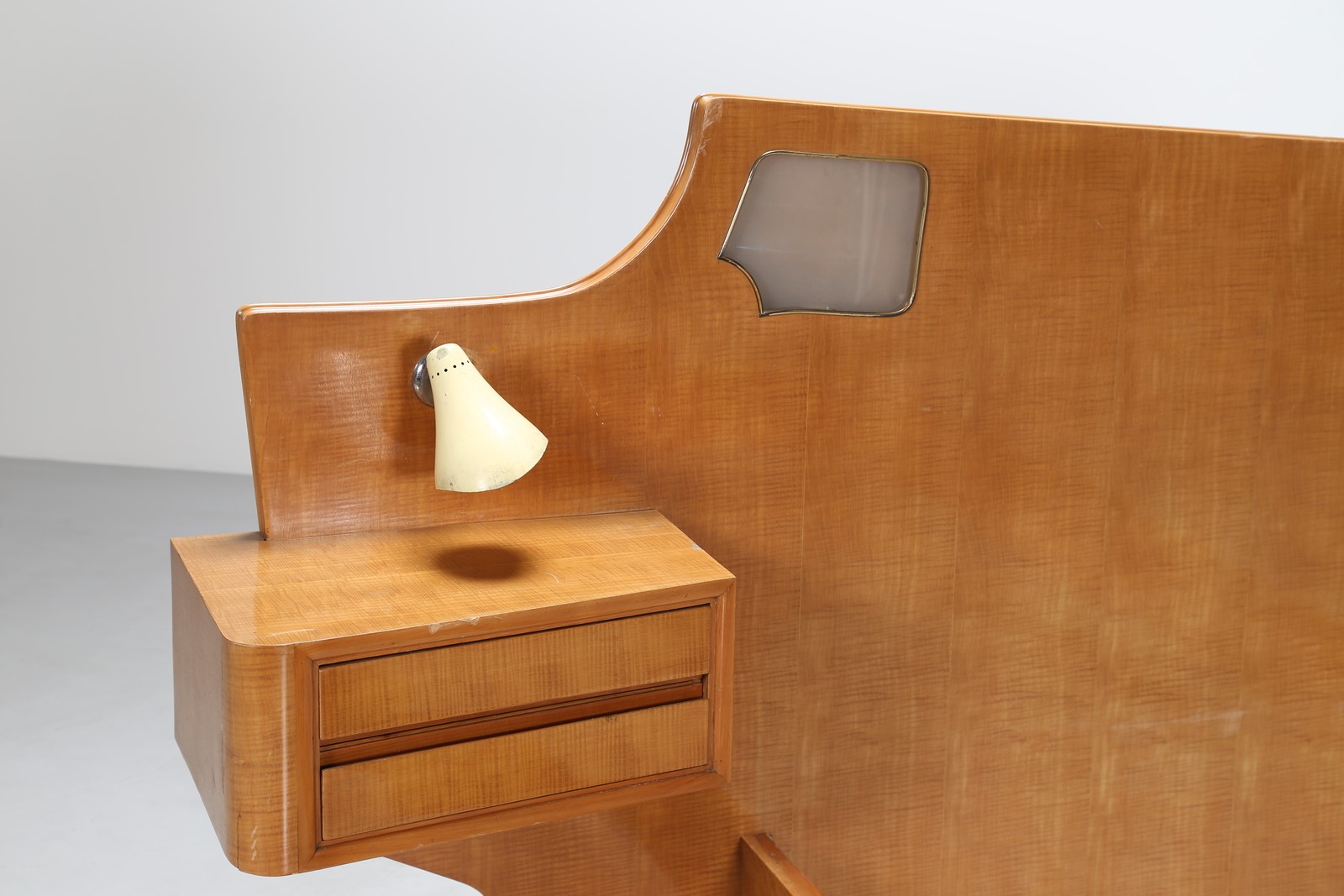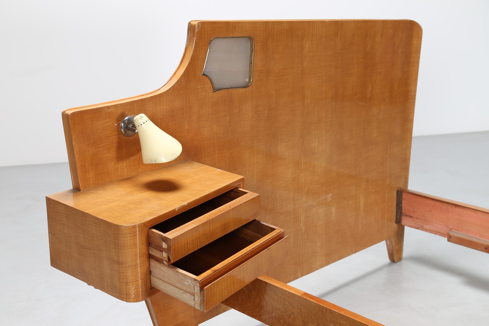 ROMANO AUGUSTO Letto singolo in legno e dettagli in ottone, lampada da comodino in metallo laccato e ottone Gino Sarfatti Arteluce, anni 50. Pubblicazione; Domus num. 227 agosto 1948 pag. 36, esempio simile