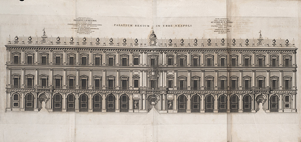 Blaeu-Mortier. Acquaforte del secolo XVIII raffigurante fronte del Palazzo Reale a Napoli (mm 400x1120) (difetti)