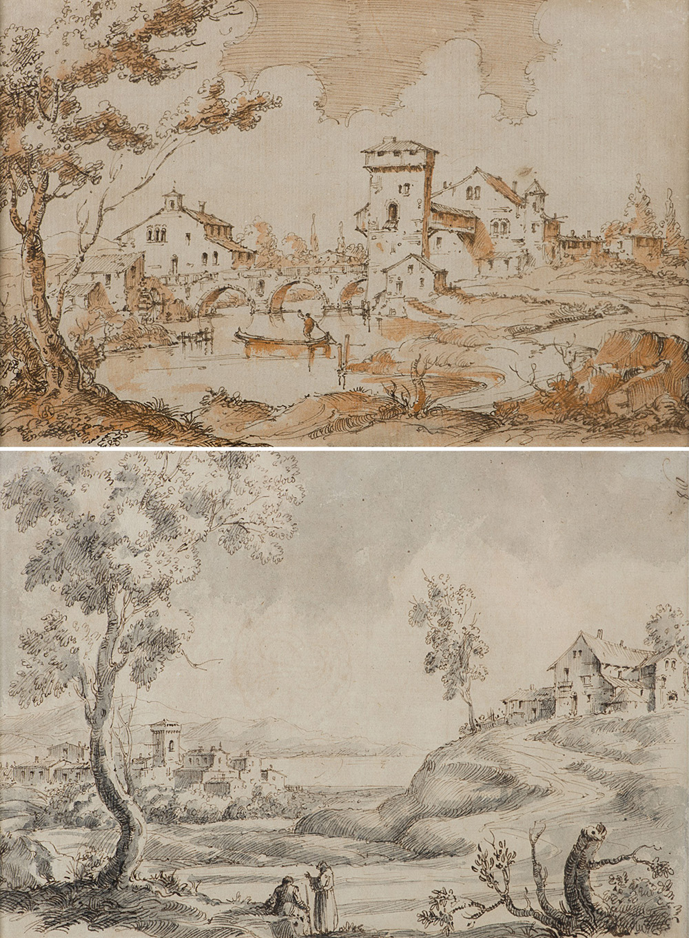 20th-century school "Landscapes" two drawings, pen washed (about mm 170x250) Framed (defects)