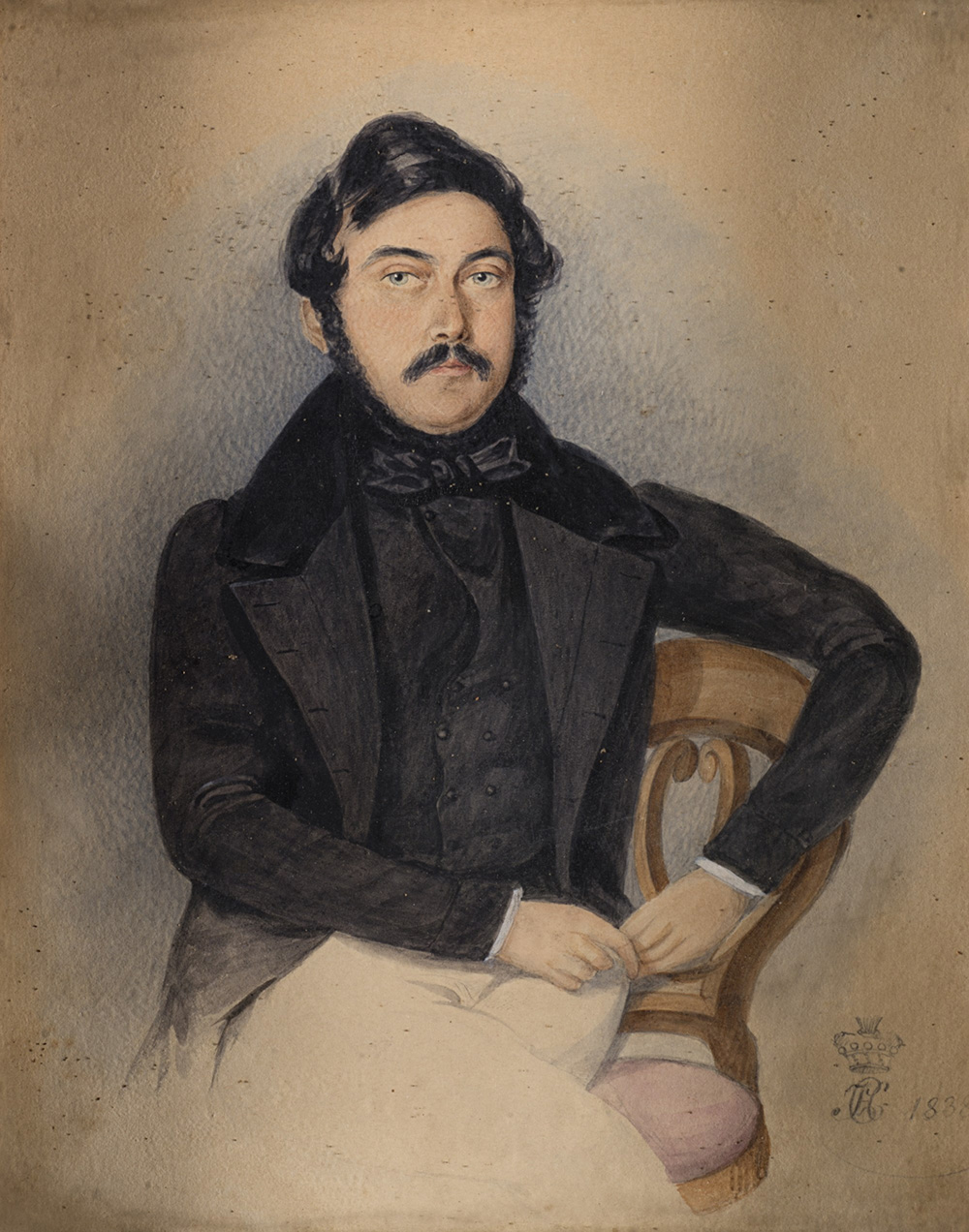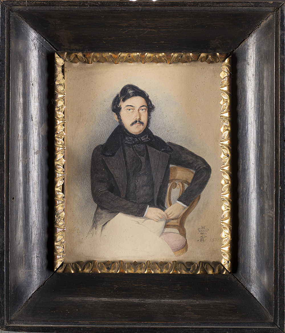 Scuola del secolo XIX ''Ritratto di gentiluomo'' acquerelli su carta (mm 170x140) siglato e datato HC 1838, in cornice coeva (difetti)