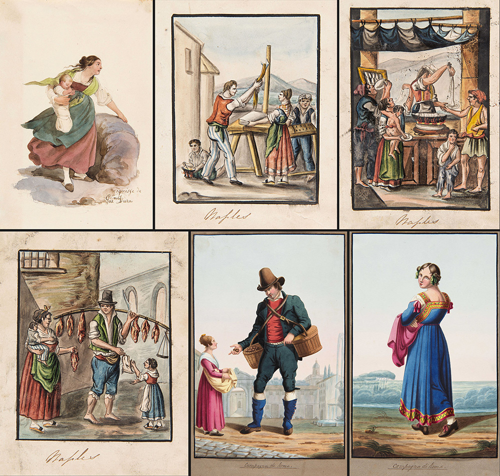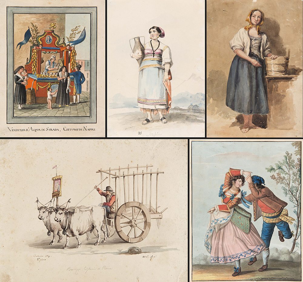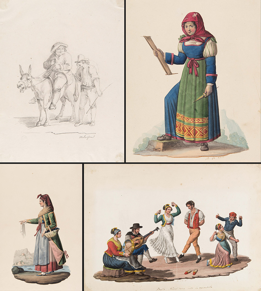 Dura, De Vito, Meli e anonimi secolo XIX. Diciassette fra acquerelli e disegni raffiguranti costumi popolari e scene di vita (misure diverse)