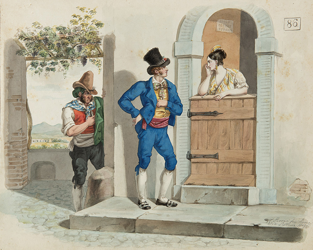 Lotto composto da due acquerelli del secolo XIX raffiguranti banditore di vino e scena popolare firmati F. Ferrari Roma (misure diverse)