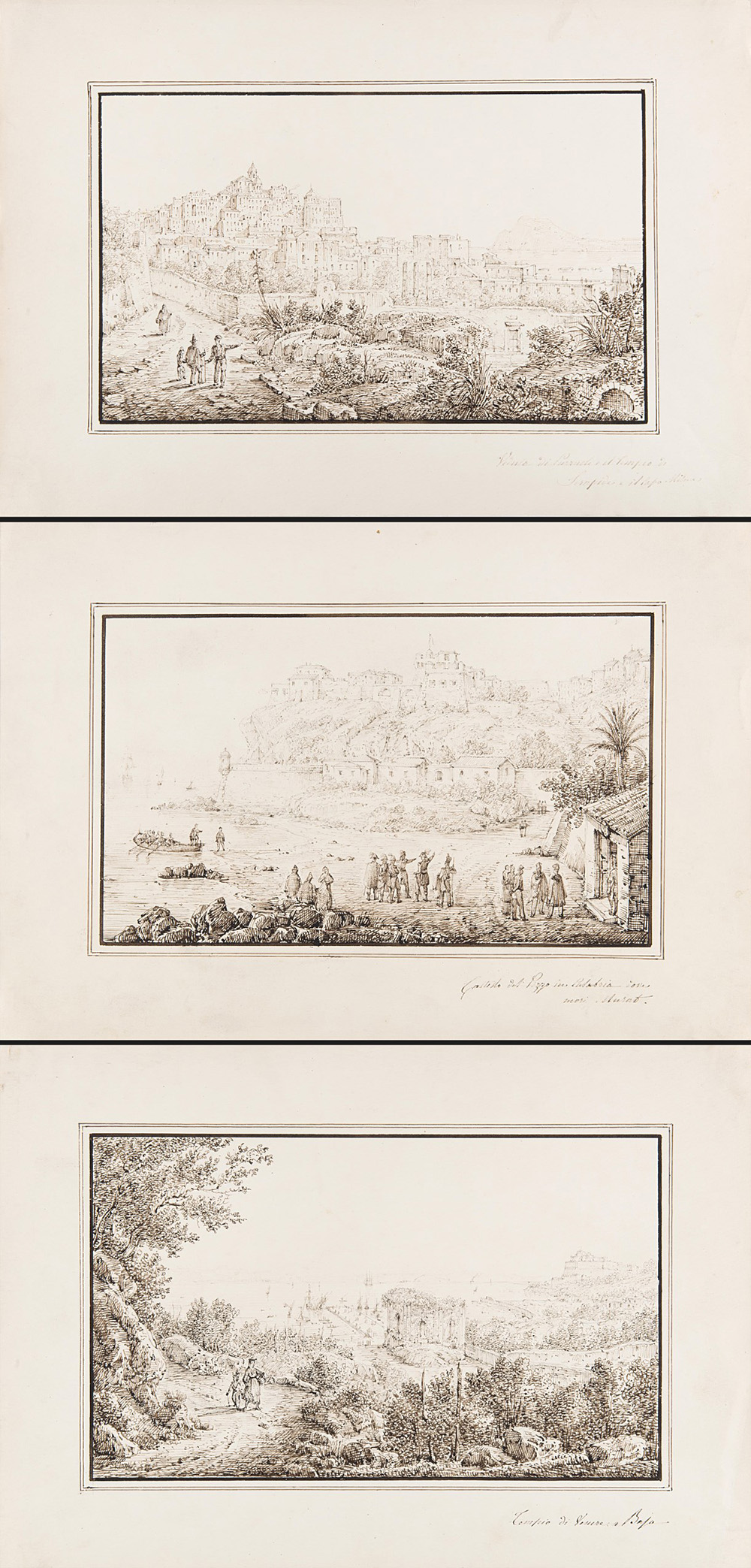 "Temple of Venus", "Castle of Pizzo in Calabria" and "View of Pozzuoli" three drawings, pen and brown ink (mm 180x290) titled at bottom