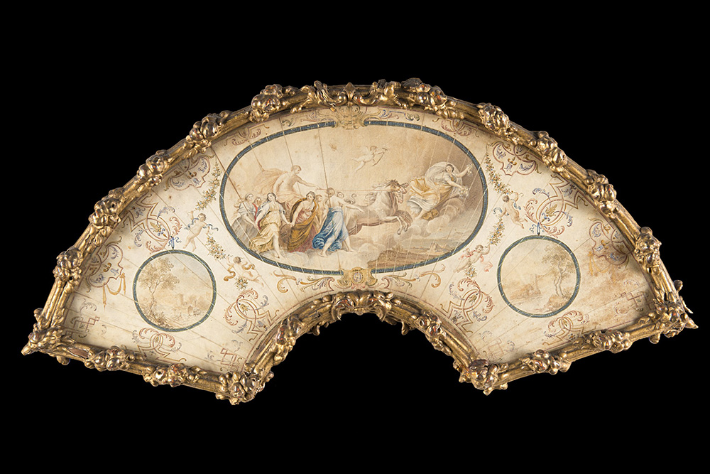 Scuola dell'inizio del secolo XIX. Ventaglio con scena del Carro di Apollo, tecnica mista su pergamena (mm 510x160) In cornice coeva in legno intagliato (difetti)