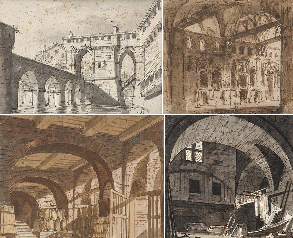Scuola italiana, fine secolo XVIII - inizio secolo XIX. Gruppo di quattro disegni di scenografie, misure e tecniche diverse