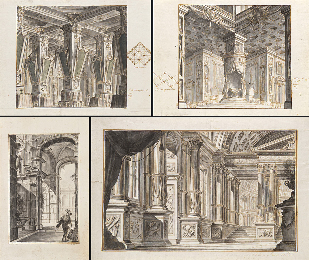 18th-century Italian school "Four studies for architectures" pen, brown ink and watercolour (mm max 275x420) with inscription "A.D., A.C. Marzo 1776, di 17 Maggio/1776, e Dic. 128bre" (defects)